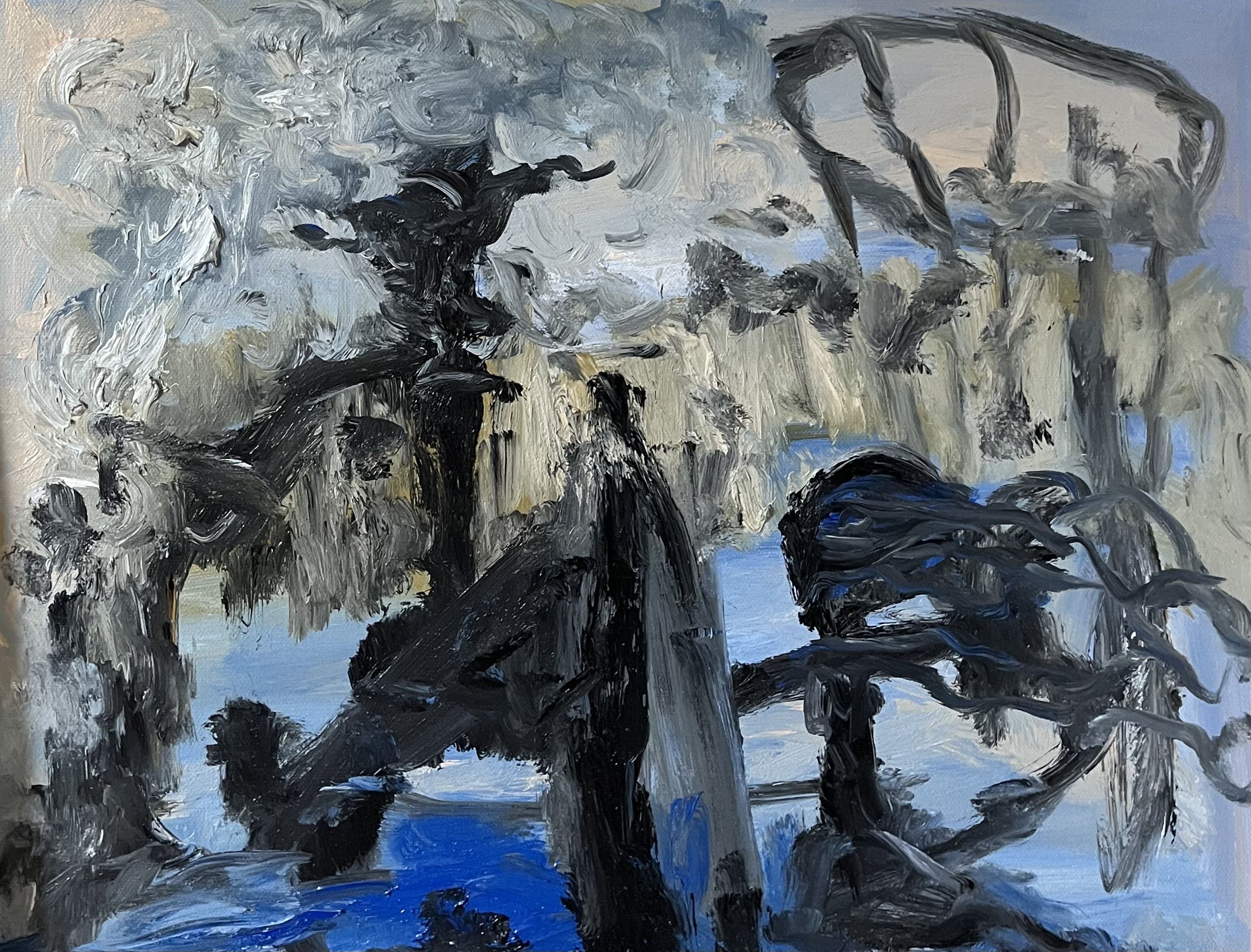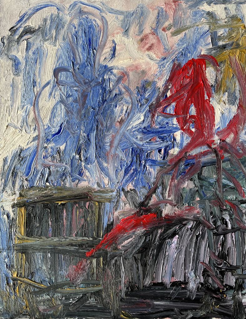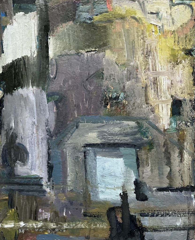 Impressionism taught us how irregularly painted objects could still evoke realism. Smith pushes the dissolution to the point closest to losing the image in an atmospheric quality of reality. Whether it’s splatter, smear, or the haphazard mixing of paint loosely; she rejects certainty in the hopes of better approximating feeling. Smith’s paintings are open enough to allow for interpretations but still adhere to some element of realism. Objects and shapes work both non-objectively and as approximations of reality. Where texture is visible, brushwork gives shading, and colors are expressive. Hard lines are not equally prominent, edges vary from hard to soft and obliterate borders. There are numerous distinctive value changes, light and dark contrast, which further enrich the compositions.