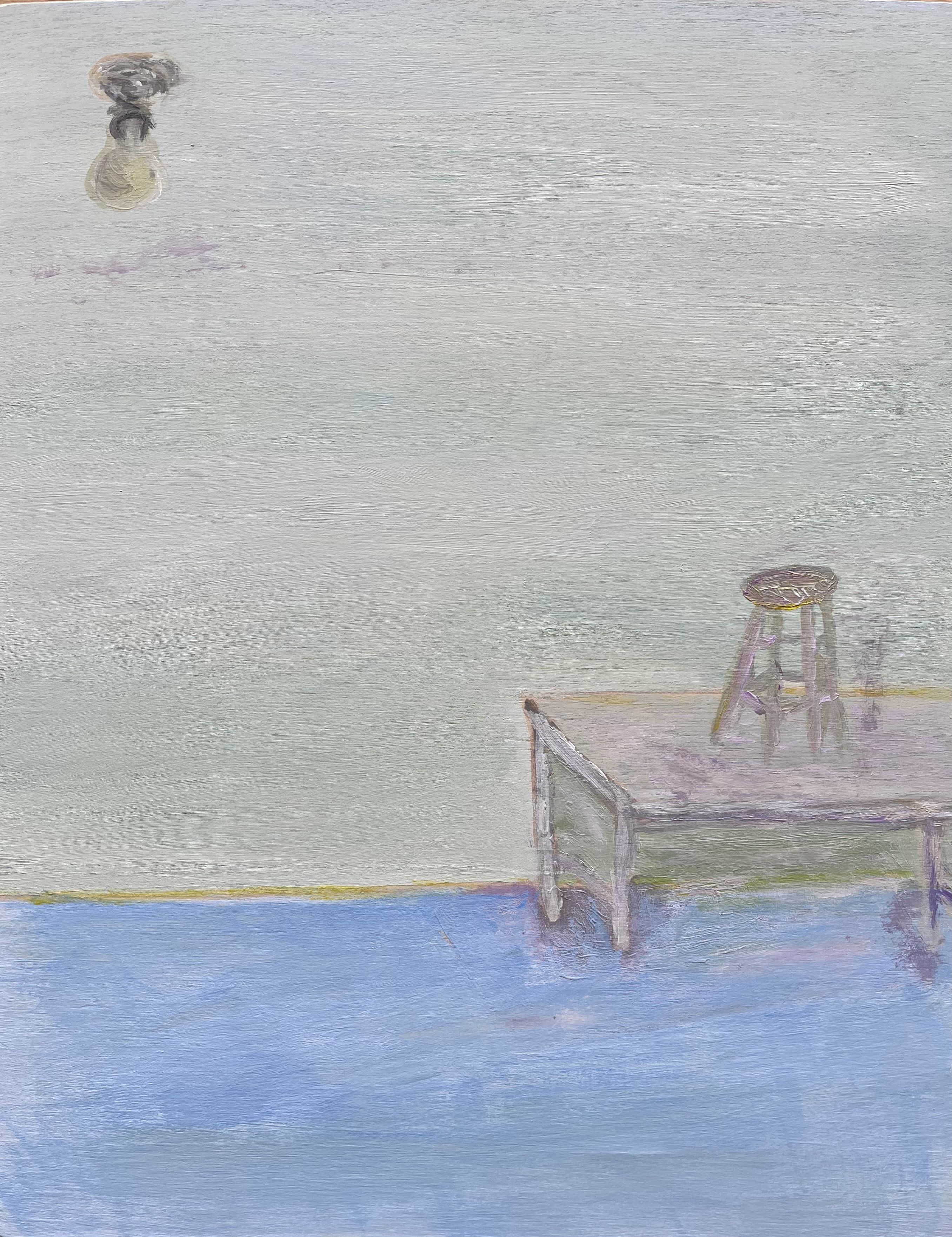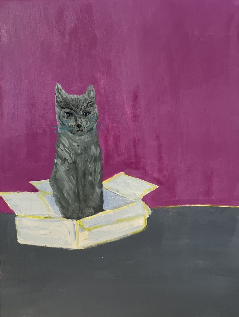 These paintings are mysterious, but not because they rely on ciphers, rather they offer enigmatic personal narratives and interior spaces that give way to more expansive areas outside of the painting’s four corners. Quirky or even naive, they show Smith painting in a different form, just as a novel (which Smith has published) is different from poetry. They are an opening to a different part of her personality, and convey lightheartedness and an almost insouciant impression. A cat standing in a box, a picture of a stool and light-bulb, a dripping paint can, and other subtle subjects lend reflections on how we project ourselves onto our living spaces.