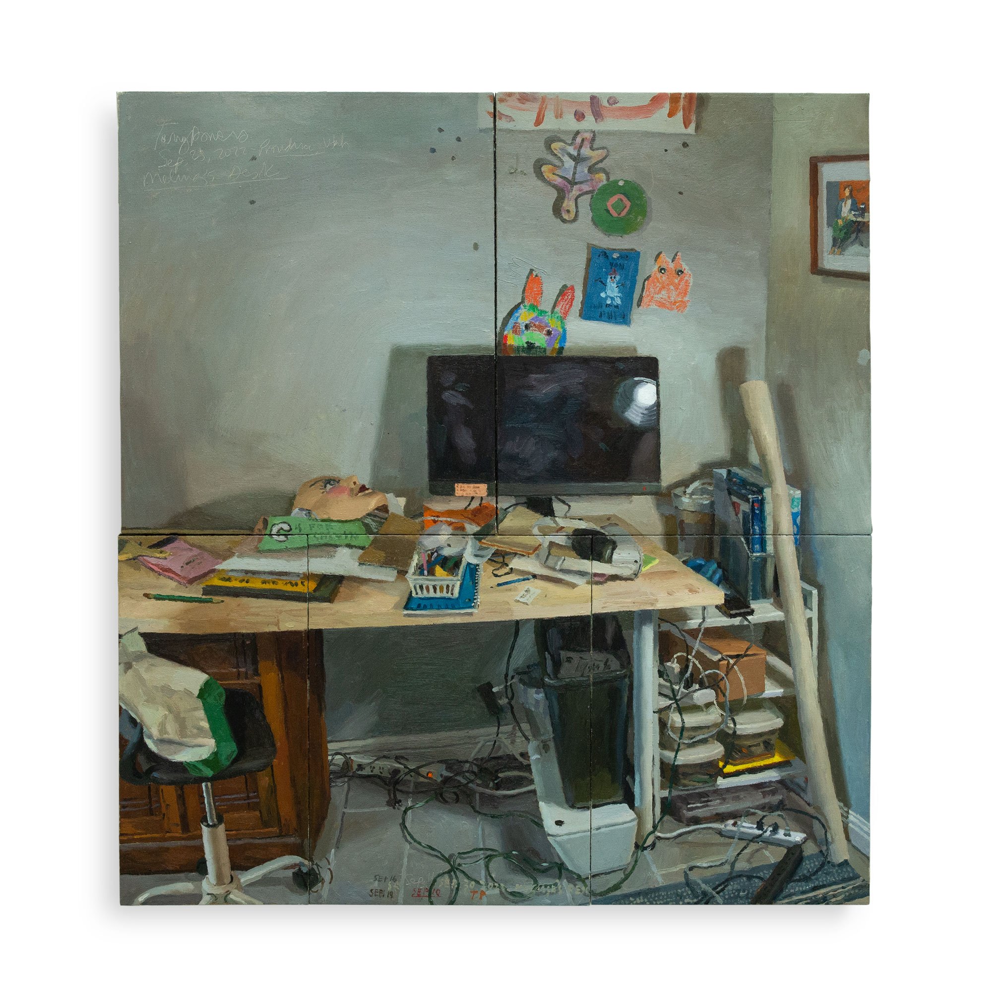 How much of what he is looking at will actually land in the painting is one of the more alluring aspects of Powers’ process. Powers begins by stretching a canvas then making preliminary compositional choices. Sometimes he becomes frustrated that he’s cropped the scene into a surface area that he later wants to expand. This is apparent in “Creeping Death,” [oil on linen, 46 x 38, 2023] where the bottom right panel of his wife Melissa’s desk, which was the first of this series of paintings he worked on, wasn’t enough to hold the growing composition of wires and objects. Without hesitation, Powers simply added panels to accommodate the growing orbit of the composition. We also see this in “Winter” [oil on linen, 40 x 36 inches, 2023] and in “Painting 4” [oil on linen, 16 x 20 inches, 2023]. The latter is particularly noteworthy as Powers brilliantly fuses two canvas segments together but purposely allows the crease line not to match up accurately. The seeming misalignment acts as an authorial comment and reminder that the viewer is looking at a subjective construct – as if Powers is saying “let’s not forget it’s a painting after all.”
