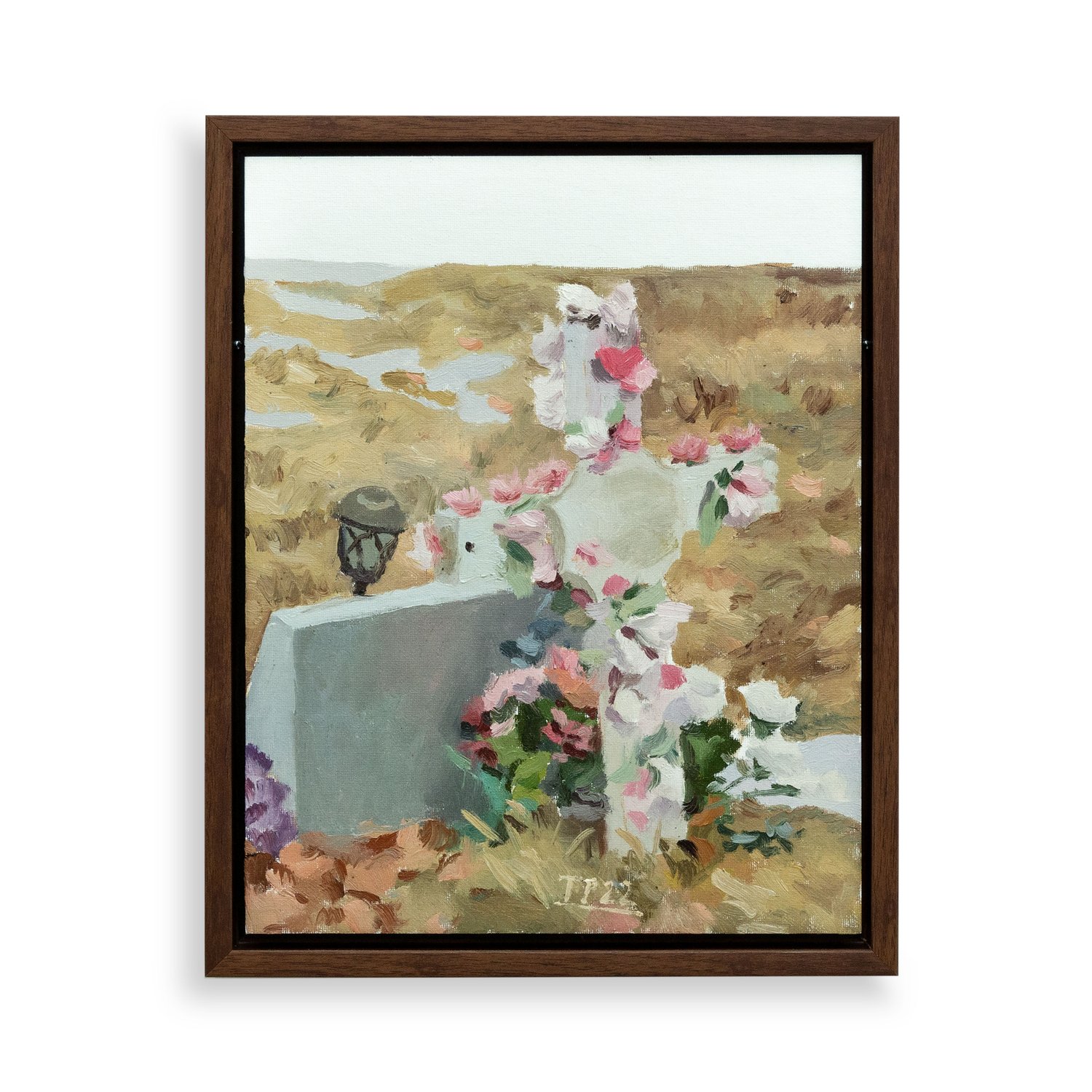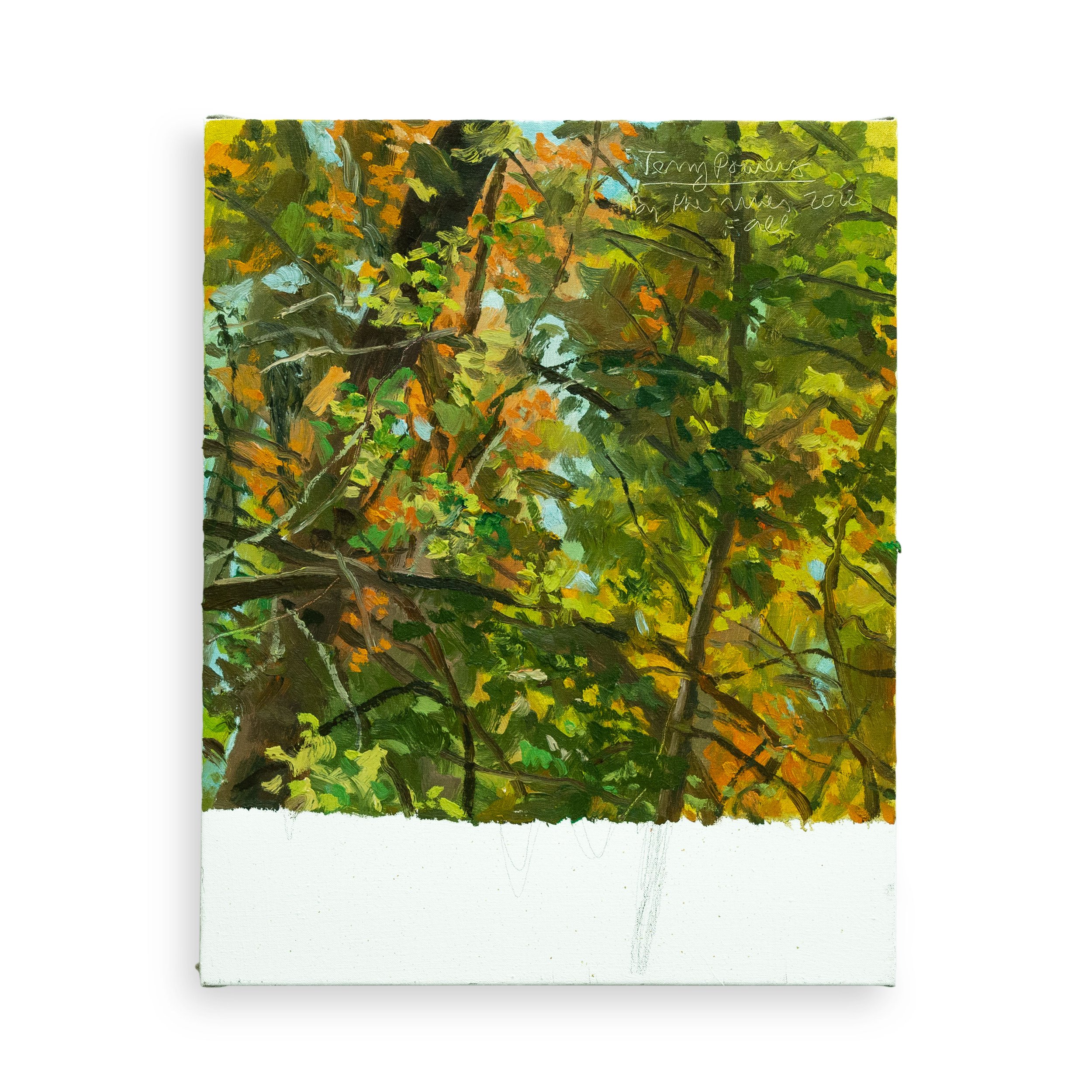 Powers accepts these creative impulses and rejects academic and traditional expectations. “David” [oil on linen, 16 x 20 inches, 2022] which depicts the closeup of yellow and green foliage of a tree, quintessentially the colors of fall in Utah, could strike a viewer as unfinished. Powers leaves a good portion of the bottom of the painting surface blank, except for parts of the underdrawing, which remain visible. This painting should fail. Yet, somehow Powers conveys exactly what he wants to: that he is both only going to paint what is necessary to convey the scene and that he’s unafraid to let the viewer see the process behind the painting; here, exemplified by the unfinished qualities.