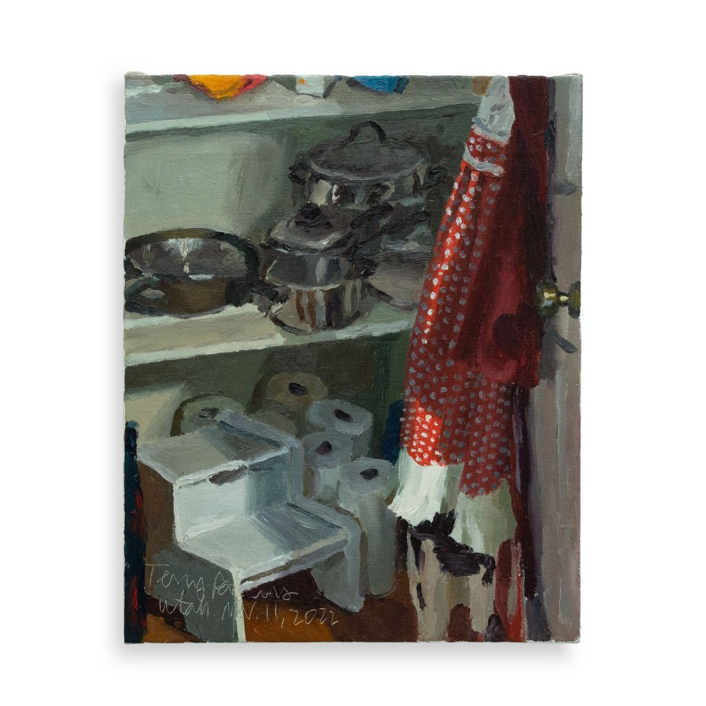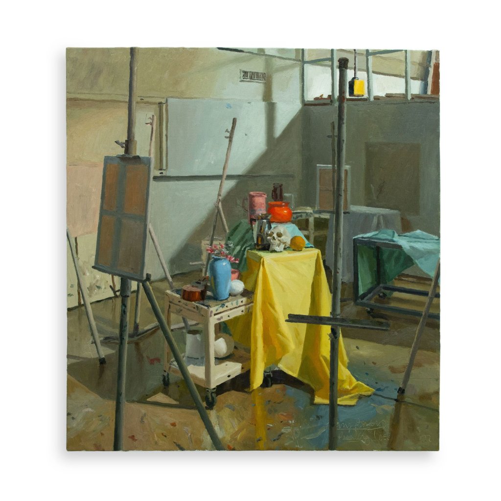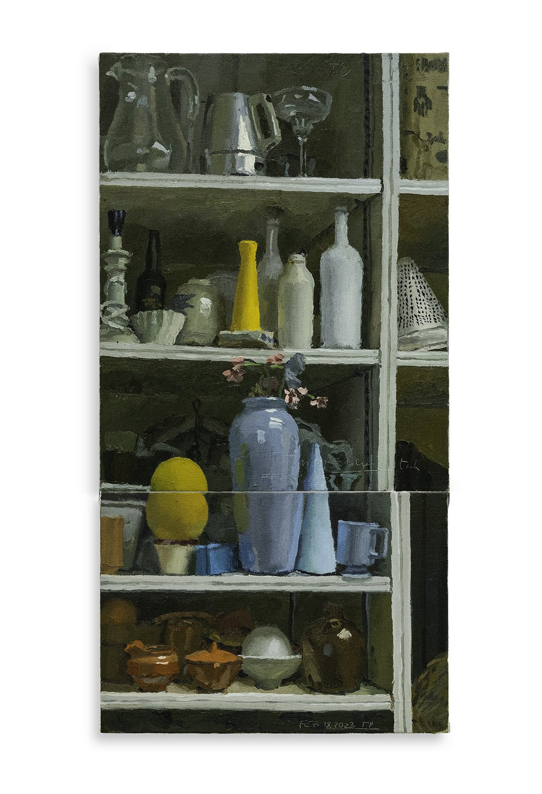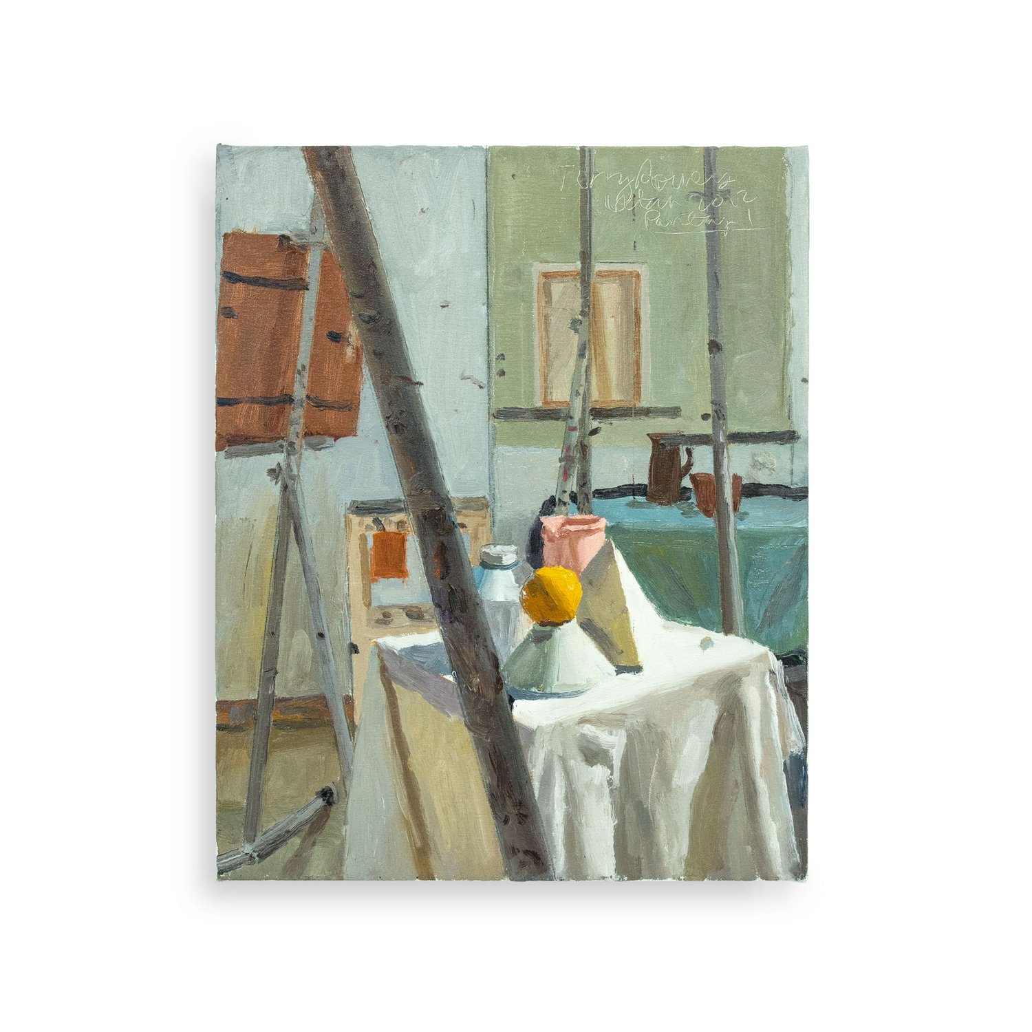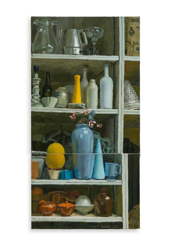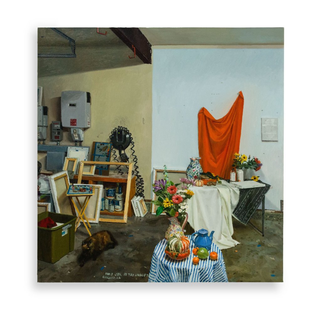 Terry Powers presents 14 paintings in an exhibition at the recently opened Guerrero Gallery on Verdugo Road in Los Angeles. Now based in Logan, Utah, where he is on the faculty at Utah State University, Powers is a well-known observational painter of elaborate still lifes. Most of these are of complex interior spaces, including his own painting studio; places he’s grown accustomed to in his own life and in which he is immersed on a daily basis. His paintings are ubiquitous before they are his focus, meaning they preoccupy Powers before he gives in and finally paints them. The familiarity is apparent as one considers the supple manner in which his brush renders the various scenes that seem both mundane and rich with subtle color and texture. Powers is adept at composition, yet surprisingly, he isn’t fond of staging the moments, prefering to paint things as he finds them; fearing, as representational painter and critic Fairfield Porter was apt to say, destroying the moment.