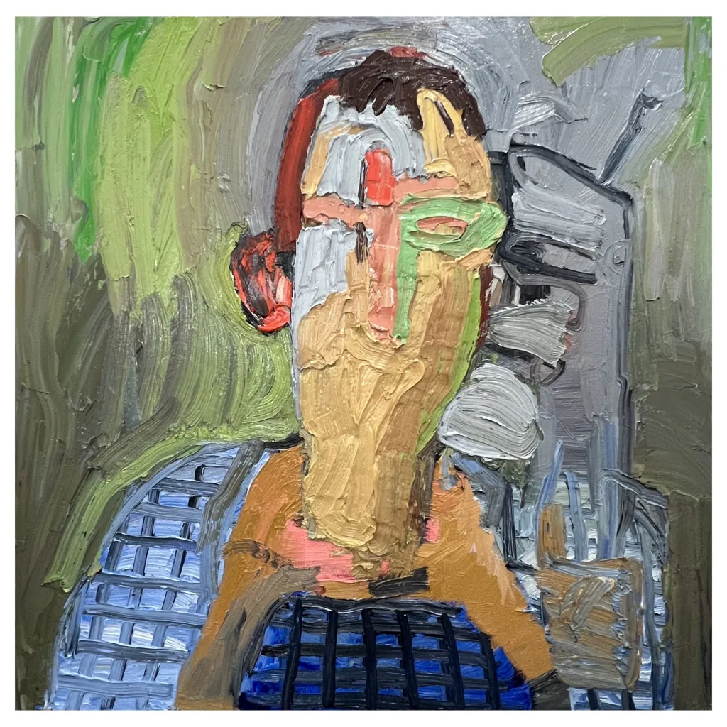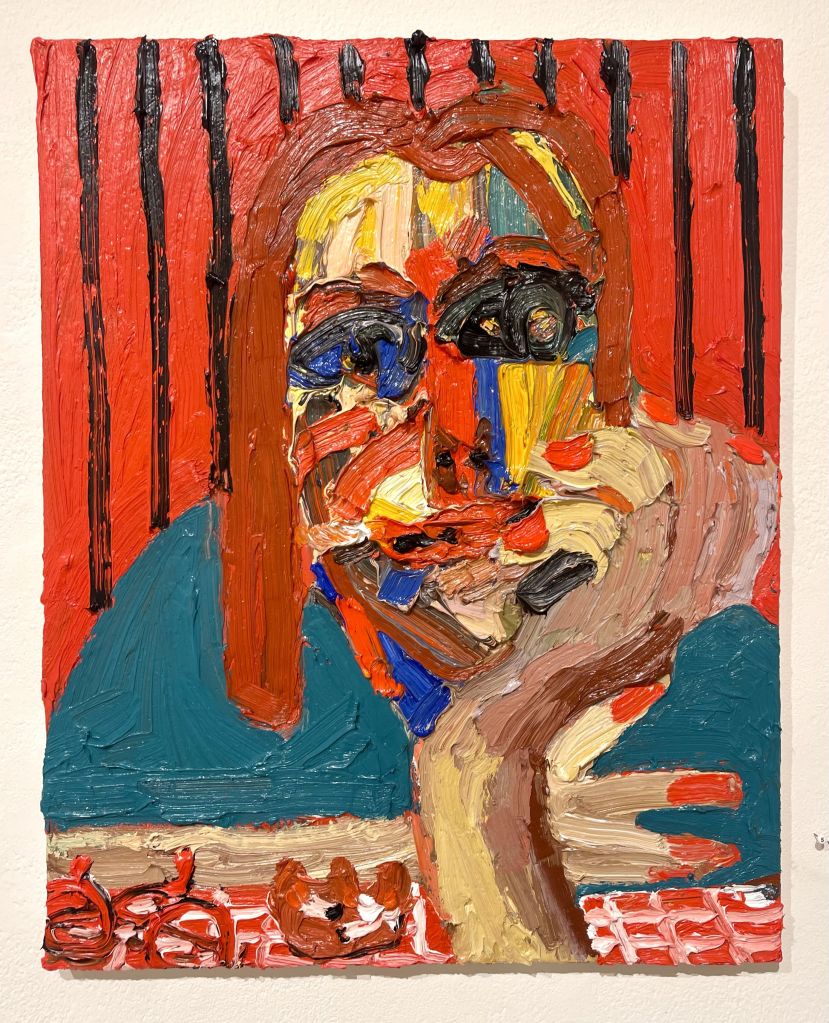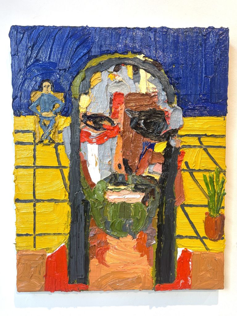 The face in this painting has a vertical, yellow element along the left cheek which seems as if it should be disruptive or at least distracting. It’s not a tear (depicting crying) but catches the eye because the brush stroke is counter to everything around it. In many of the paintings, this one included, Villalba purposely offers asymmetrical renderings of human faces. He seems to make an imaginary vertical split along the center of the head with each side being unequal and containing different brush marks and color combinations. In “Self Portrait (with Cigarette)” the rendering of different colored eyes (pink/orange and green) is striking even though lopsided. This is also present in “Tiny Portrait” and “Michelle at the Cafe” [Tiny Portrait, oil on canvas, 6 x 4 inches, 2023; and Michelle at the Cafe, oil on canvas, 20 x 16 inches, 2023]. It is this very abandonment of symmetry in the painting of faces which helps infuse the images with movement and consciousness, and allows the viewer to peruse the composition longer because there is so much to see here.