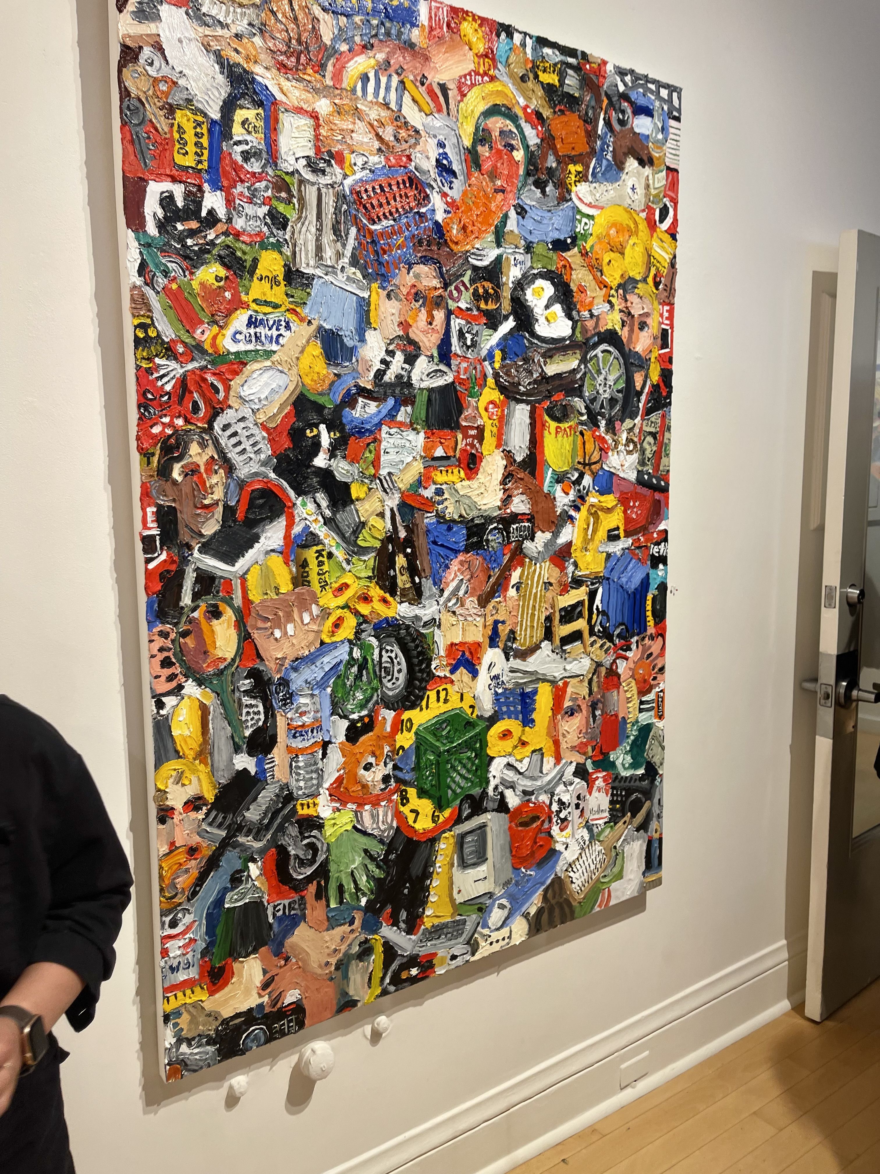 Part of the show is inspired by the living environment, in this case the North Beach neighborhood once inhabited by the beats and Bay Area figurative painters, many of whom studied or taught at the San Francisco Art Institute on Chestnut Street, including Park and Brown who were both active in the 1950s. Villalba’s view from his apartment on Stockton Street, near Washington Square Park, overlooks Lombard Hill which influenced three densely painted larger works in the exhibition. So-called “collage paintings” by Villalba are jammed packed with a multitude of objects and faces forming a seemingly crowded medley of experiences. Evoking Gerhard Richter’s series of cityscape paintings, including “Stadtbild Madrid” (Cityscape Madrid) [oil on linen, 109 x 115 inches, 1968] in the collection of the SFMOMA, presenting a flat gray-toned street and city view, Villalba has seemingly painted his own impression of Lombard Hill without resorting to the elements of traditional landscape. A hodgepodge of objects substitutes for the delineation of known urban features. The group of three paintings look as if one is viewing an apartment building split in two by a tornado, or a complex assemblage of colorful LEGO pieces; it has delightful compartments of information and visually interesting color options a viewer will easily become transfixed and enamored by. The crowded scenes, viewed carefully, show both immense detail in the articles rendered, and also approximate the visual topography the painter knows, abstracted to make a new language of landscape. Objects sit in space, sharing an equality of placement, and rely on depth, resulting in compositional harmony.