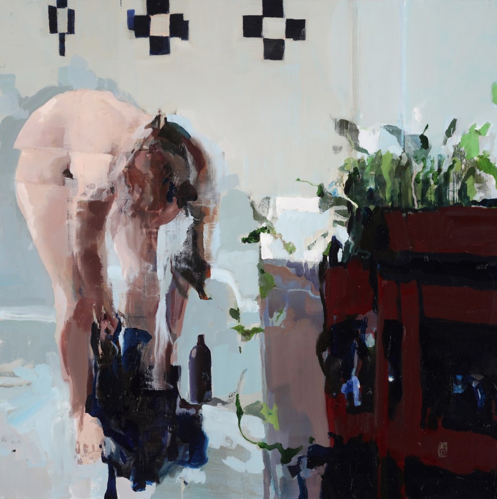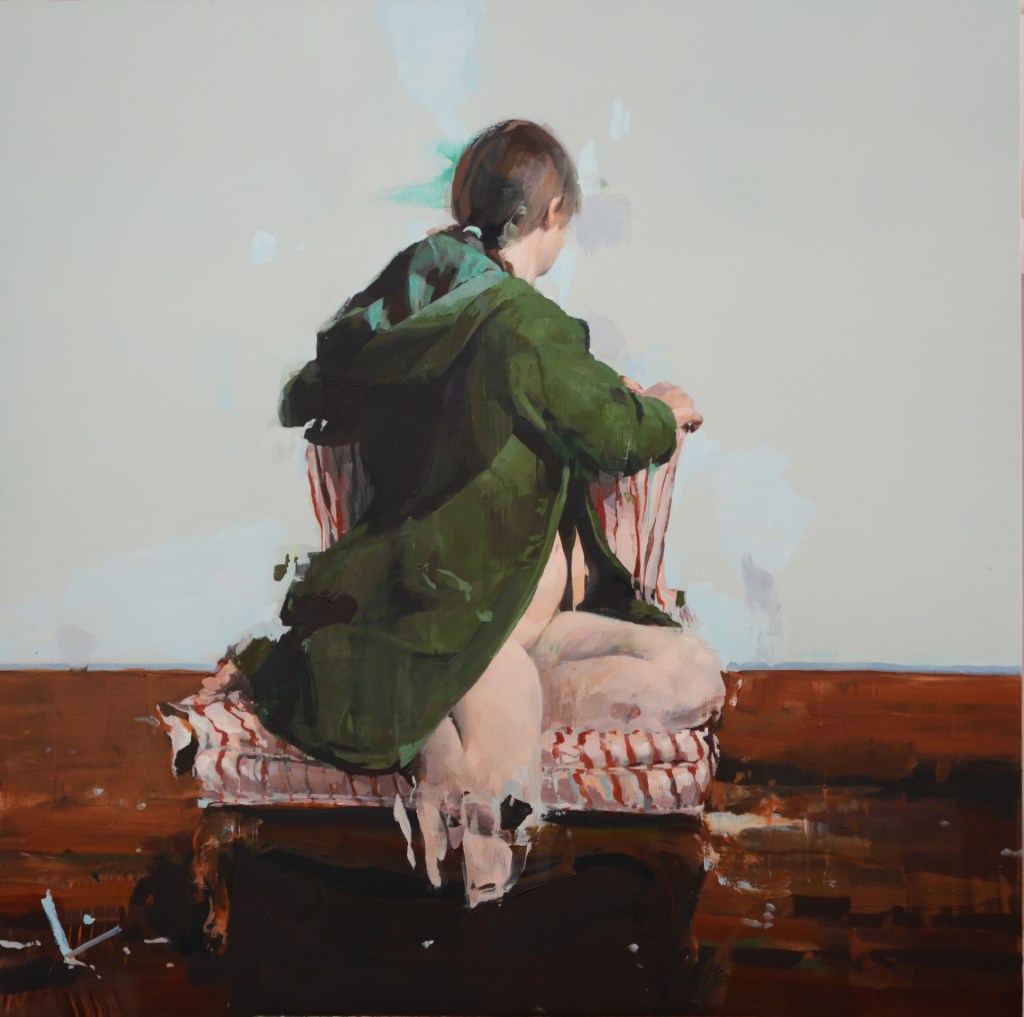 In “Long Hours” (oil on panel, 18 x 18 inches, 2022) Kanevsky has painted a seated nude woman on the edge of a bed draped with an elaborate red pattern bedspread, sitting in contemplation. The upper right area of the composition is largely desolate, with a horizontal red line offering some spatial context suggesting an interior angle. The entire upper third of the painting background seems unfinished, yet it is precisely as it should be. Evocative of thought and an almost abandonment of being seen, the figure sits with her shoulders hunched over in perfect repose. We have all felt this way; as if exalting a moment of peace; entirely without concern for anyone else, the woman seems to barely breathe.