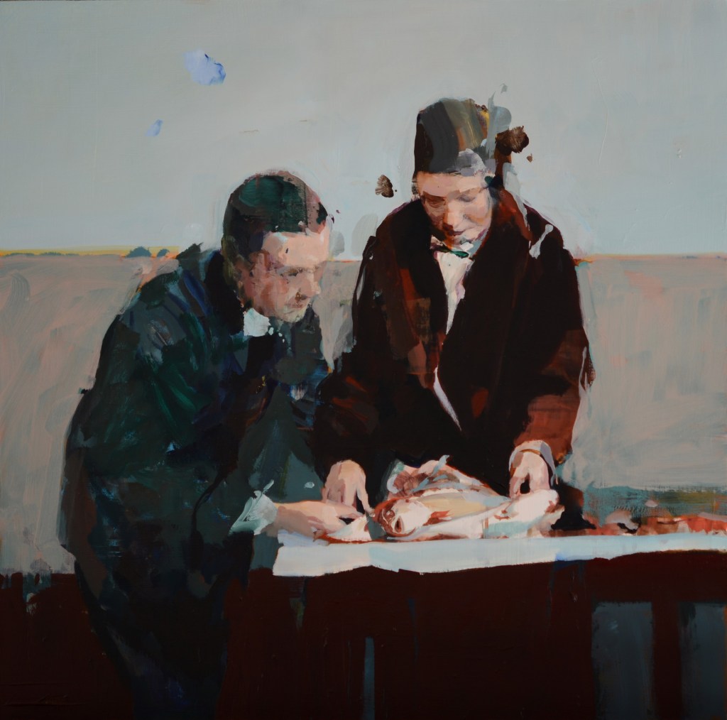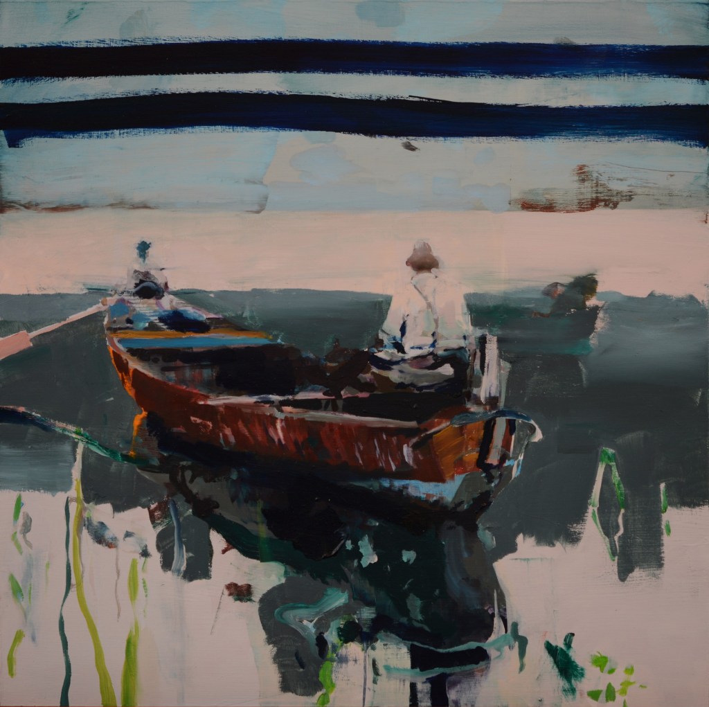 Kanevsky is primarily a painter in conversation with feelings and mood, rather than a presenter of narrative images. Viewers can find something that resonates in his practice for themselves, but looking for a linear narrative is not what these paintings are about, though this remark is complicated by Kanevsky’s utilization of descriptive titles and graphic representation. In “Fishing” (oil on canvas, 18 x 18 inches, 2022), for instance, one sees delineated elements that seemingly impose the expectation of storytelling; two men in a boat embarking on a fishing trip. However, the real truth of the painting is the sentiment it expounds to us through its amalgamation of various qualities: rubbed out other boats and an assortment of visual possibilities, the rendering of water with large meandering swaths of paint, the sky or horizon represented with two large dark blue horizontal bands of paint, and a sprinkling of colors in what appears to be a somber or quiet atmosphere. We can feel the moment, the hesitancy or expectancy; the sheer beauty of the stand-still occasion. Likewise, in “Fish Oversight” (oil on panel, 18 x 18 inches, 2022) we see a man and a woman engaged in a rather mundane affair: unwrapping a paper package containing an entire fish. Again, a viewer looking for narratives will focus on their possible relationship: is the handling of a dead fish a metaphor for something? But there’s a care and expectancy and even excitement as they uncover something that is a source of sustenance or their shared respect for a once living thing.