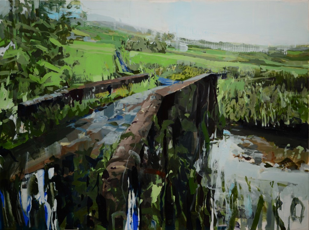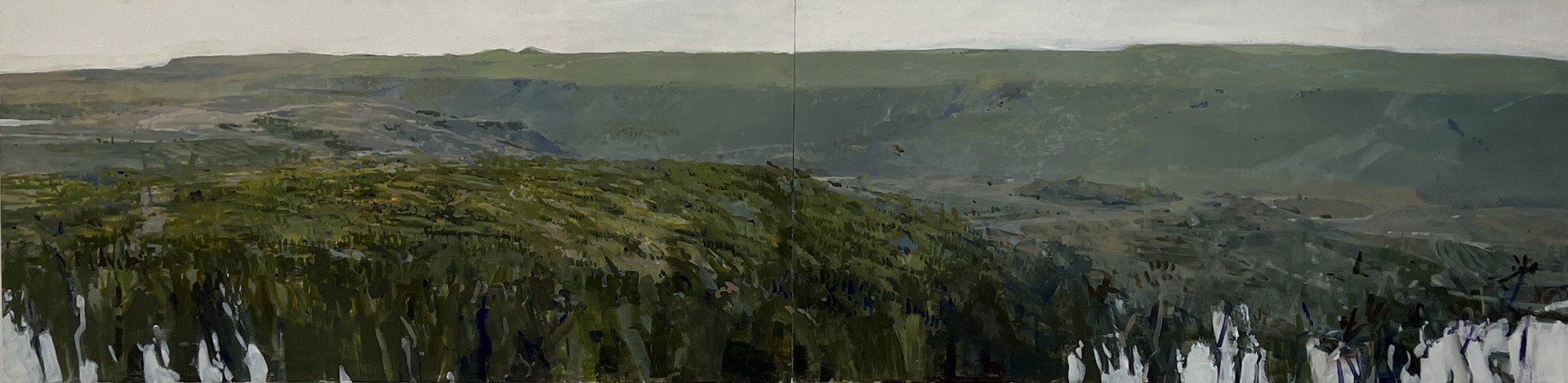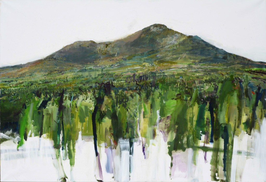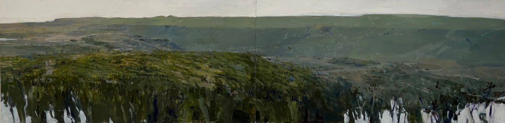 Kanevsky’s landscapes feel as if painted by someone embedded within the scene, making it familiar and convincing. Kanevsky places the viewer right into the foliage in contrast to how a plein air artist might render a scene from a distance; noticeably disconnected from it as if peering at the scene rendered. The viewer can’t help but feel Kanevsky has placed them standing before a portal waiting to step into it. A viewer will experience this precipice vantage point in “Big Mountain” (oil on canvas, 58 x 84 inches, 2022), “El Tigre” (oil on wood, 24 x 96 inches, 2022), and “Mt. Neffin 1, Ireland” (oil on mylar mounted on wood, 24 x 31.25, 2023).