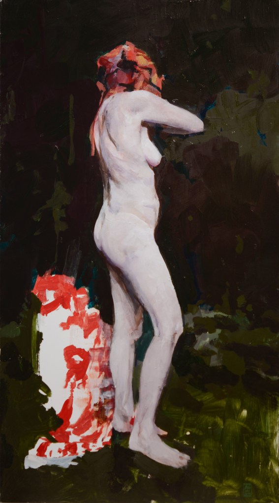 In “C.B. Taking Aim” (oil on board, 20 x 11, 2023) Kanevsky purposely left a few red paint brush marks to suffice for what is likely a cloth or robe element, though it is not attached to the figure’s hand. Even the headband or scarf worn around the woman’s head isn’t fully realized. Again, Kanevsky is revealing that he has achieved all that he wants to with the figure as is; the dark sentiments of the surrounding composition embellish the felt quality.
