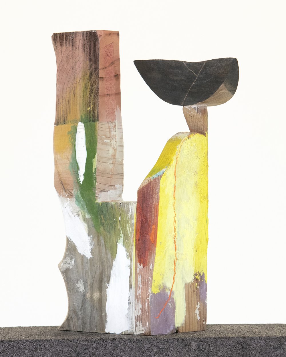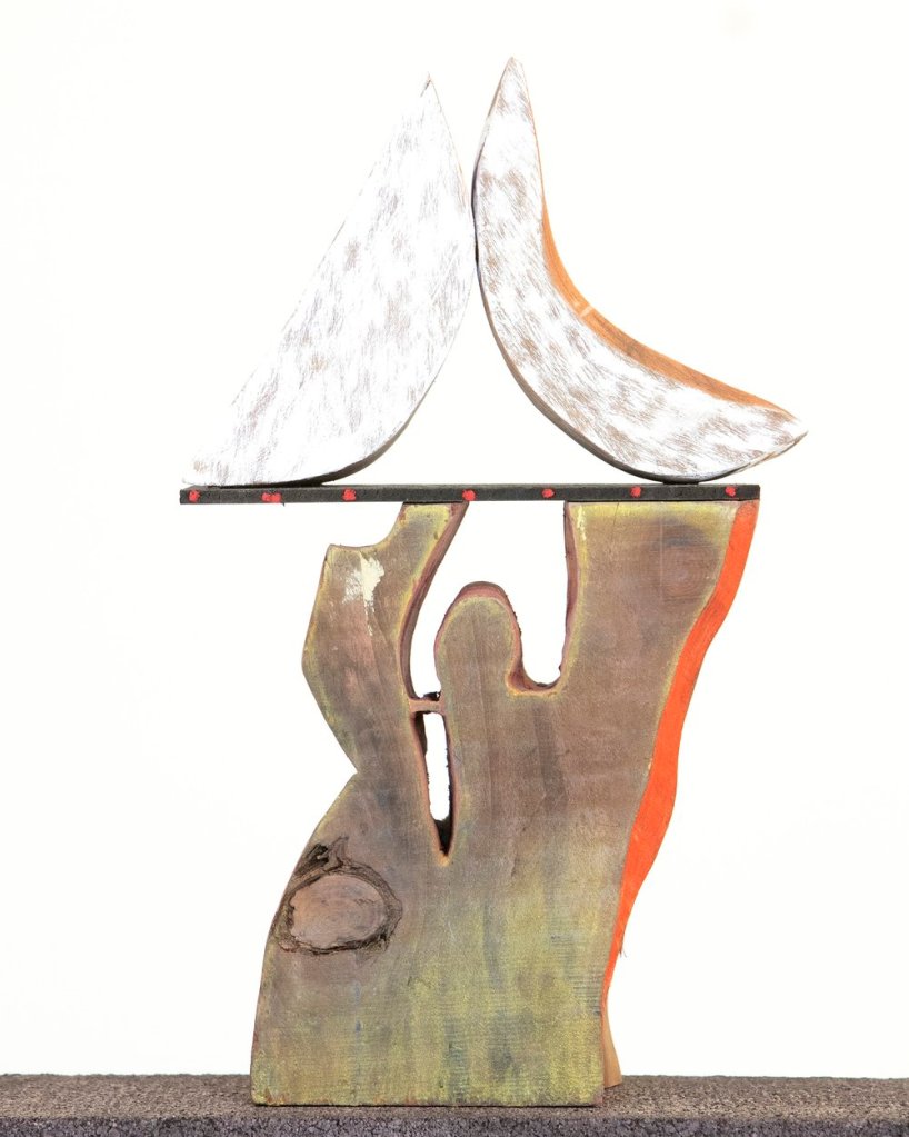 Isaac Vazquez Avila, “J.,” mixed media on found wood, 14 x 7 x 5 inches, 2025.
