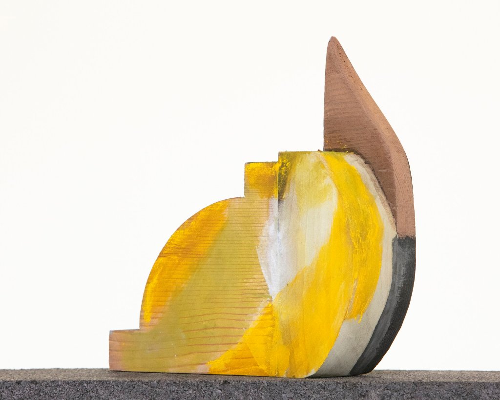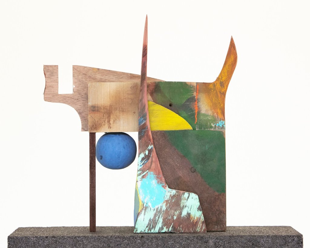 Isaac Vazquez Avila, “K.,” mixed media on found wood, 12 x 11 x 3 inches, 2025.
