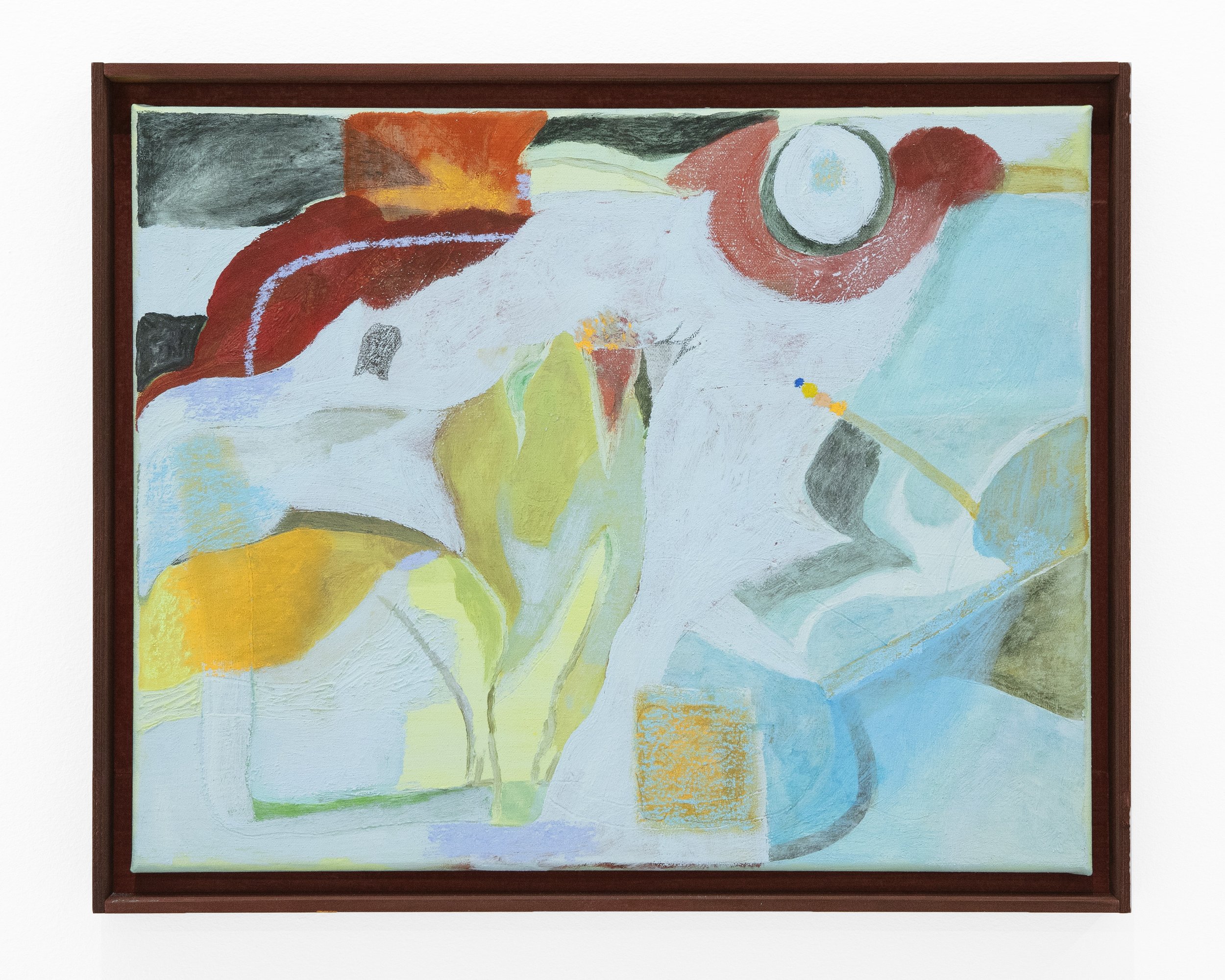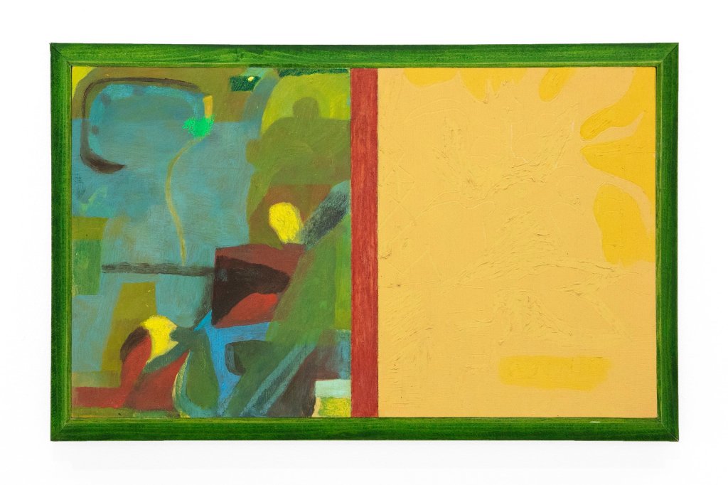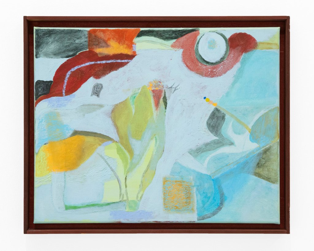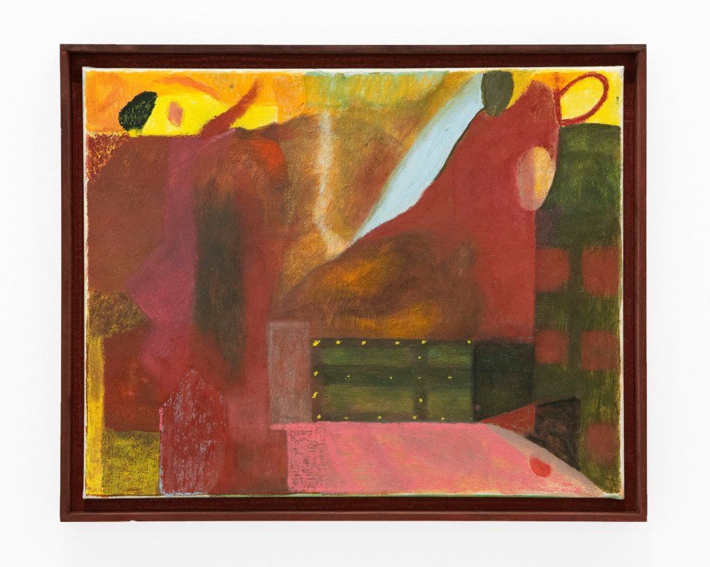 Despite Vazquez Avila’s efforts to the contrary, “A.” contains elements that seem recognizable. Viewers should reflect that this is simply the human mind seeking something familiar, which it invariably does, whether it be a face, house with windows, or even an elephant’s head in profile. He combats this natural tendency by rendering an undeniable blurriness which both satisfies the primal color impetus and mostly obliterates known forms. He’s expressly telling the viewer to surrender expectations. The brush work is, at times, reminiscent of Pierre Bonnard, who also rendered a chalkiness in his application of pigment. Both painters attain a faintness and buzzing quality to their surface evoking the impression that sections of the painting have been rubbed into the panel support. Rather than see the completed works as a victory or even finished, the exhibition conveys an expression of time, place, and movement in a composition that is really an excerpt of a larger practice. In “A.” this is augmented by a simple white frame offsetting the picture; the width in the horizontal portion of the frame is wider than the vertical, creating an entrance from which to look through at the painting. Vazquez Avila gives the frame an object quality and reminds the viewer that everything they are looking at is tamed or confined to an enclosure, yet could have easily extended beyond the manufactured boundaries.