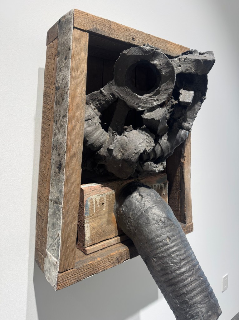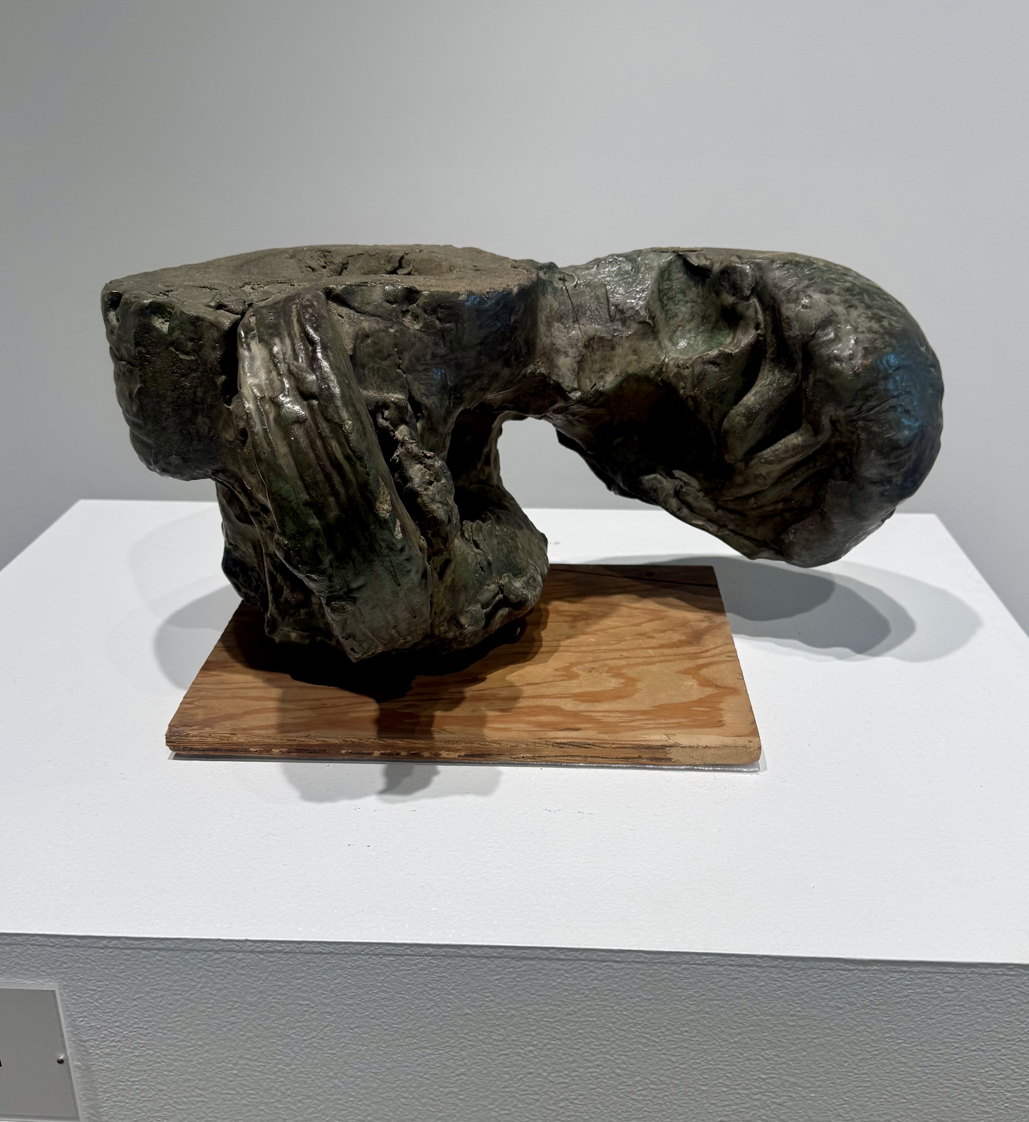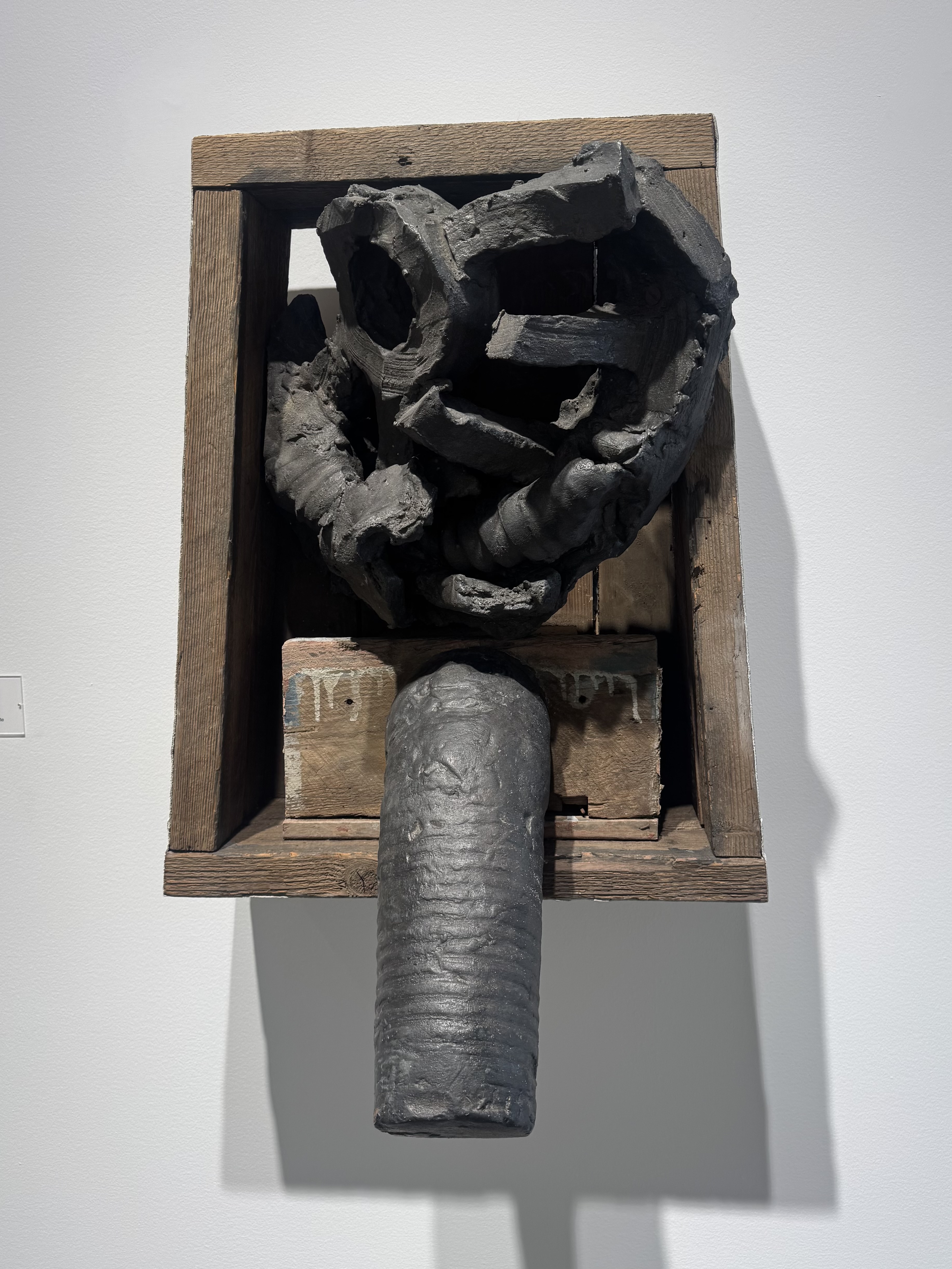 Melchert too ignored this margin. The retrospective exhibition at di Rosa SF, curated by Griff Williams, begins by presenting some of Melchert’s earliest known ceramic and assemblage pieces including Slow Boat (1962). Melchert who had famously recoiled in repugnance when he first saw Peter Voulkos’ ceramic work (while teaching art at Carthage College in Illinois) which twisted and mangled ceramic works, later studied with him in Missoula, Montana and served as his studio assistant at UC Berkeley in the late 1950s (while pursuing an MFA). Unlike Voulkos who was distinctly clay-focused, Melchert was more aligned with many of the West Coast Beat artists, such as Bruce Conner and George Herms, who were firmly rooted in utilizing found materials. Slow Boat reflects the hybridity of his practice, combining clay, wood, and lead in a purposely vague composition. Melchert allowed the materials to speak to him, presenting an abstraction, yet also forming a minimalist and somewhat raw male form. Regardless of his intention, the way the materials articulate and suggest meaning through form and textual presence, combined with the associations our minds create, resulted in multi-material artworks that pushed boundaries for viewers.