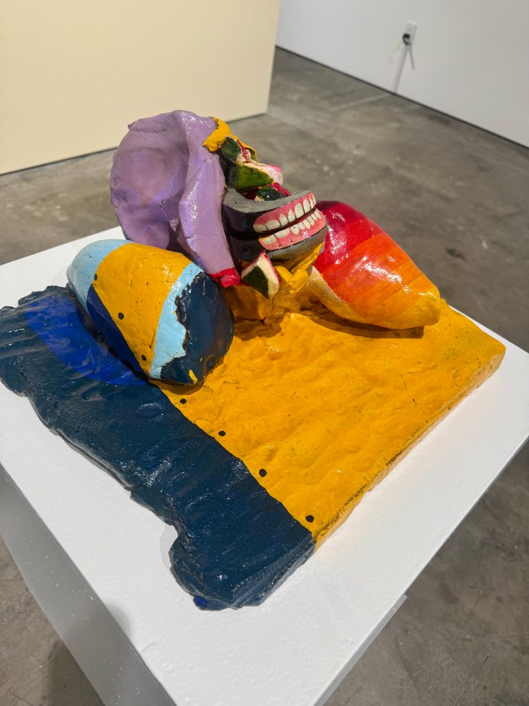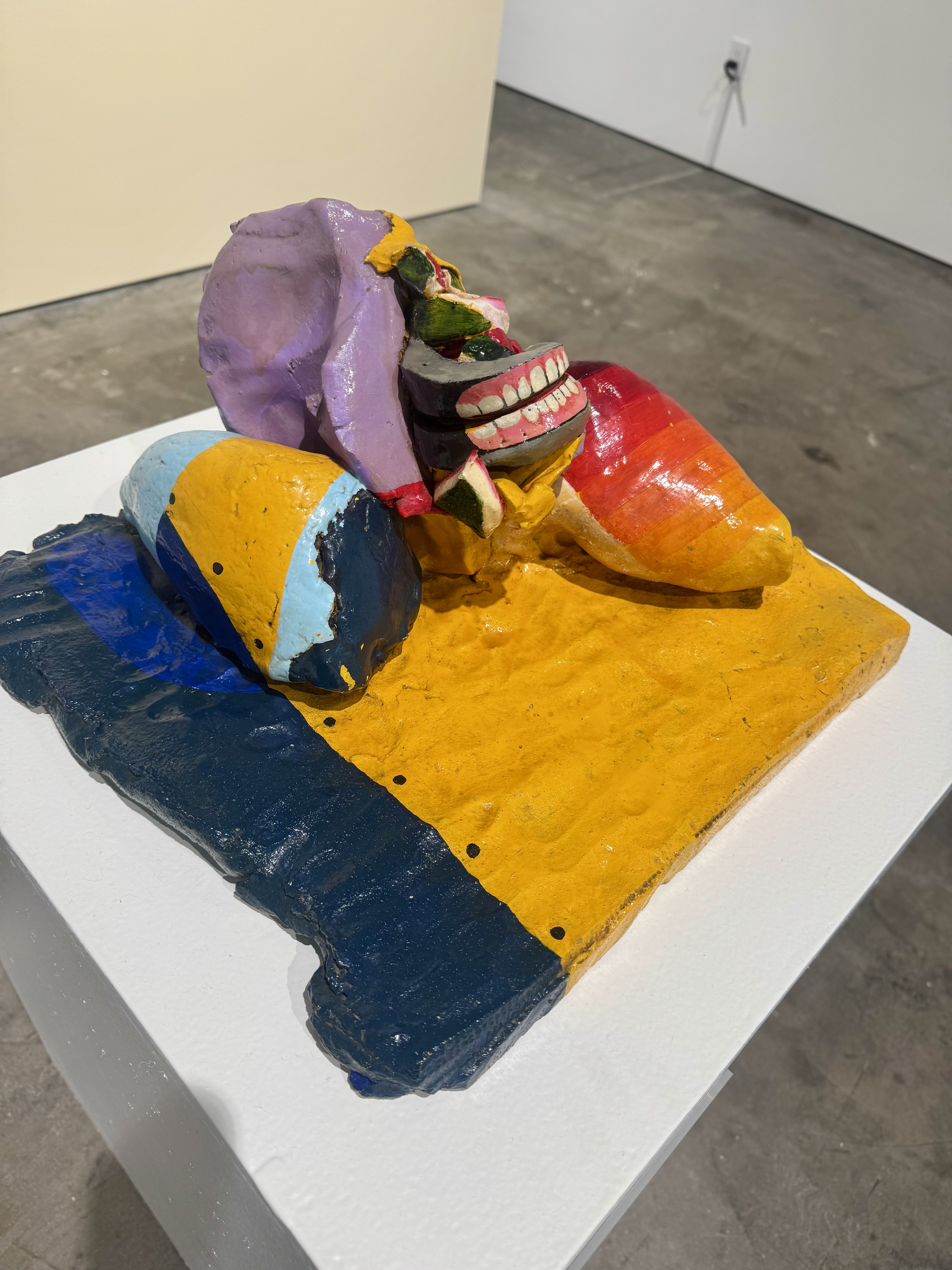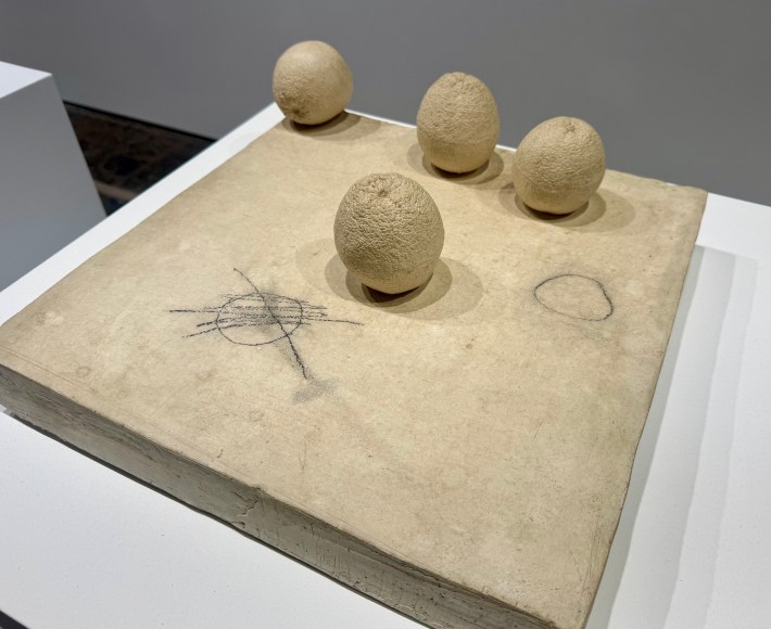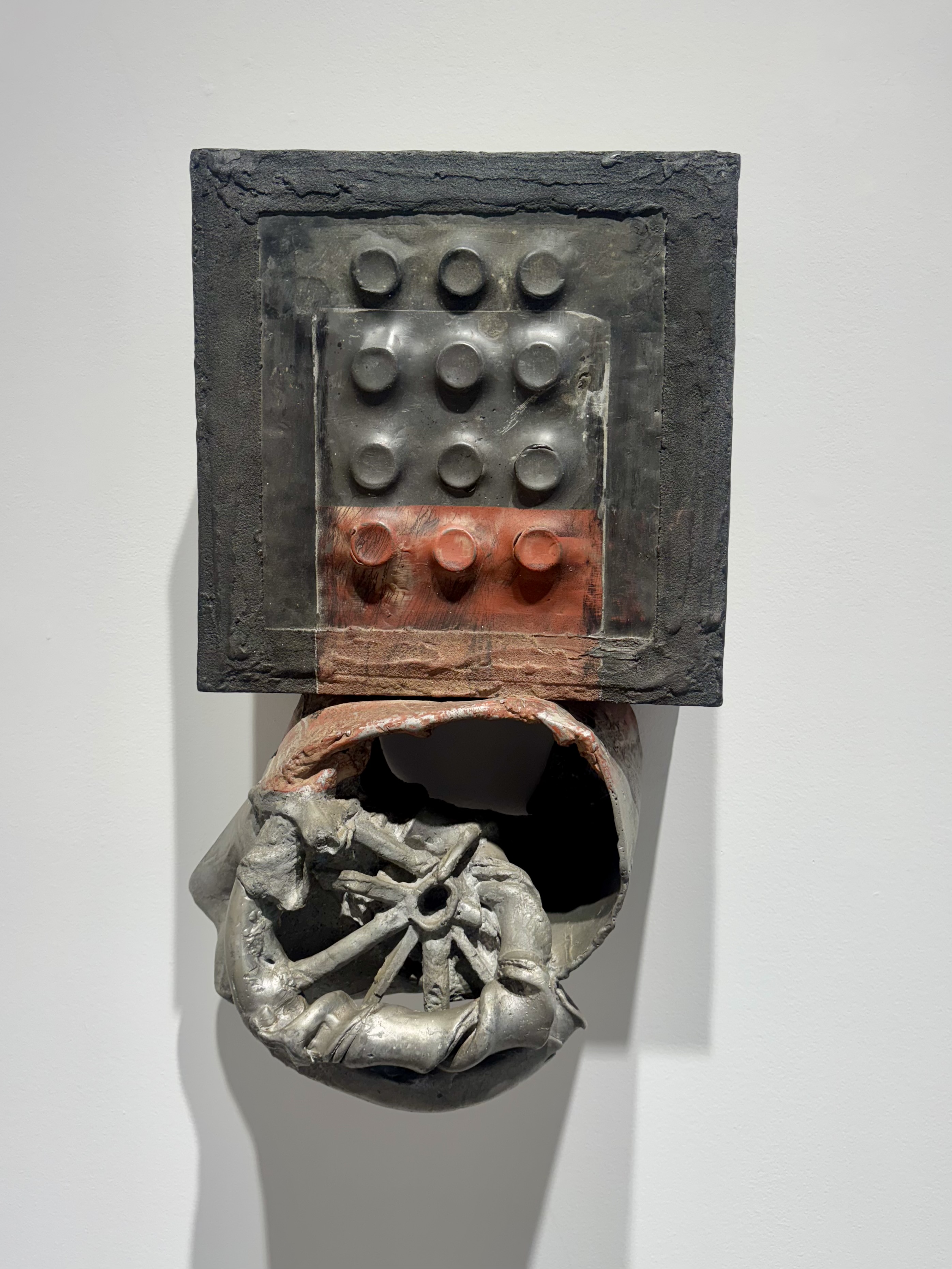Melchert too ignored this margin. The retrospective exhibition at di Rosa SF, curated by Griff Williams, begins by presenting some of Melchert’s earliest known ceramic and assemblage pieces including Slow Boat (1962). Melchert who had famously recoiled in repugnance when he first saw Peter Voulkos’ ceramic work (while teaching art at Carthage College in Illinois) which twisted and mangled ceramic works, later studied with him in Missoula, Montana and served as his studio assistant at UC Berkeley in the late 1950s (while pursuing an MFA). Unlike Voulkos who was distinctly clay-focused, Melchert was more aligned with many of the West Coast Beat artists, such as Bruce Conner and George Herms, who were firmly rooted in utilizing found materials. Slow Boat reflects the hybridity of his practice, combining clay, wood, and lead in a purposely vague composition. Melchert allowed the materials to speak to him, presenting an abstraction, yet also forming a minimalist and somewhat raw male form. Regardless of his intention, the way the materials articulate and suggest meaning through form and textual presence, combined with the associations our minds create, resulted in multi-material artworks that pushed boundaries for viewers.