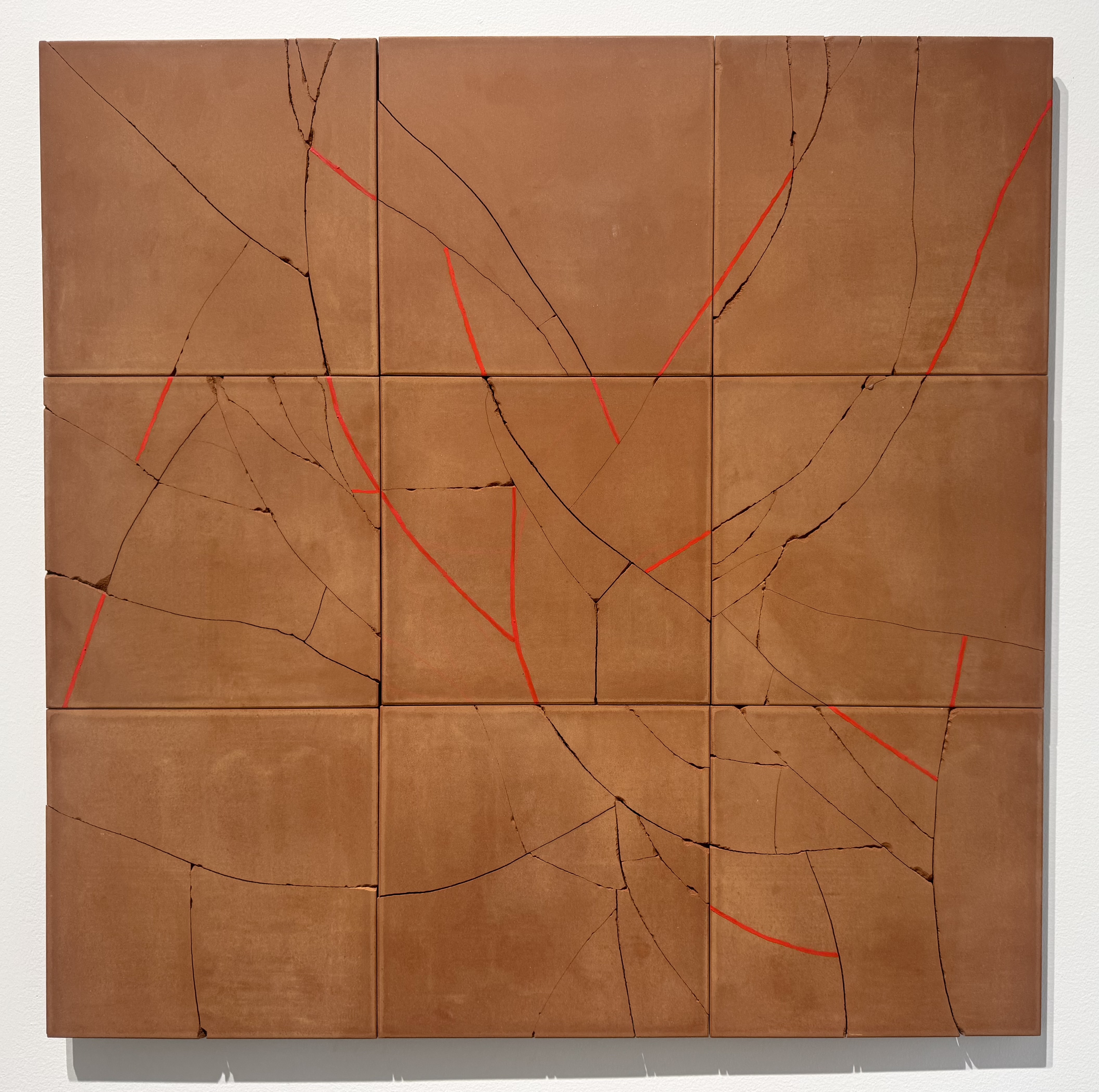 Melchert’s work with tiles was sparked by his travels in the Middle East in the 1980s and the four years he spent teaching English in Sendai, Japan, which served as his alternative service as a conscientious objector during the Korean War. Melchert must have become acquainted with the Kintsugi tradition, where broken pottery is repaired using lacquer mixed with gold, silver, or platinum. Significantly, the technique highlights a vessel’s fractures, celebrating rather than concealing its previous damage. Dating back to the late 15th century, Kintsugi assimilates the aesthetic idea of wabi-sabi, which exalts beauty in imperfection, and the Buddhist concept of mushin, which embraces fluidity and non-attachment. The kinship with Melchert’s own practice is manifest.