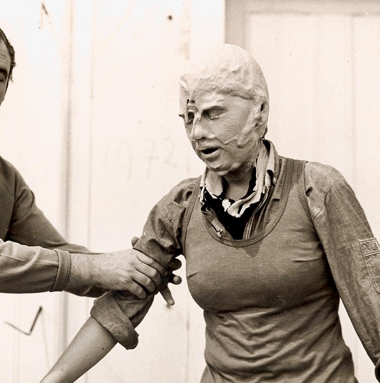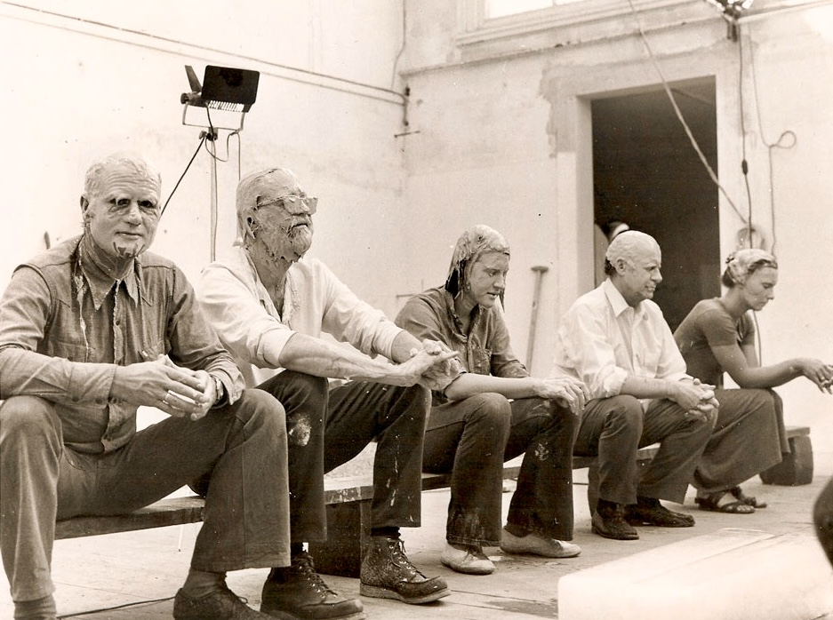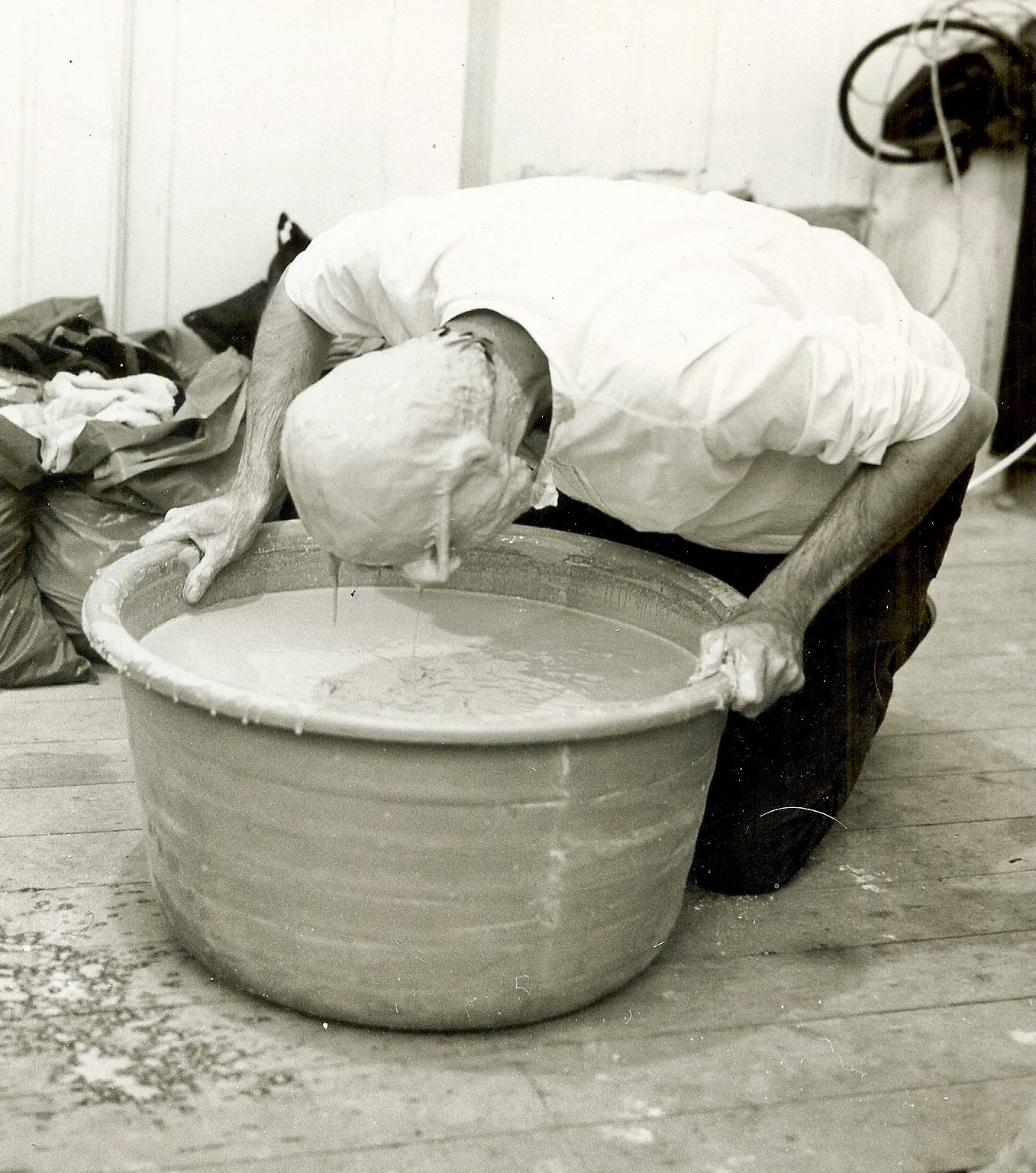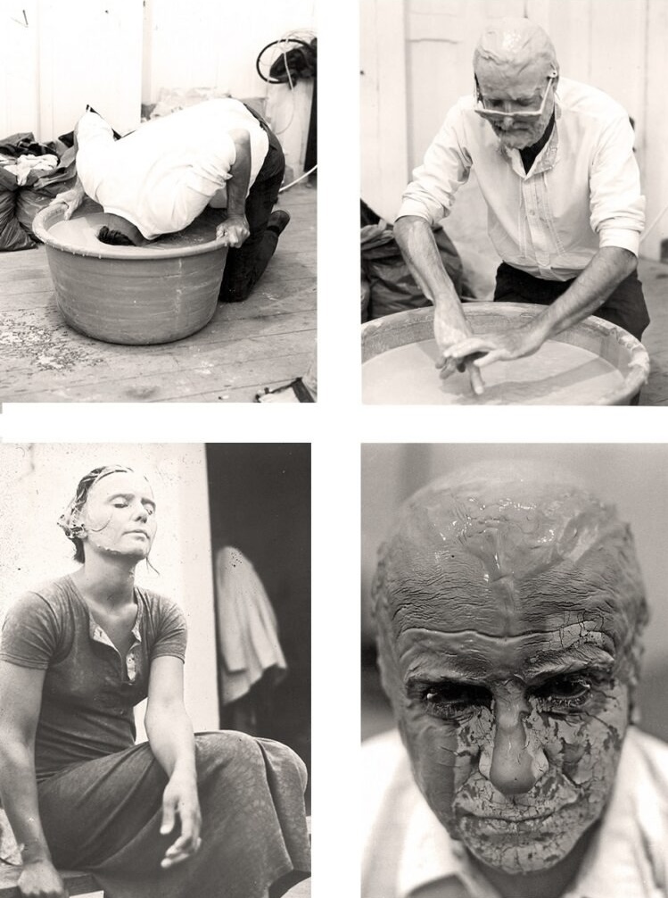 Aside from the visually striking grey-scale quality of witnessing the scene, Melchert was making a living sculpture about what the artist felt. The viewer witnessed one thing while the artists endured another. The viewer’s experience, one where disruption of normalcy is highlighted by a seemingly absurd act, combined with the meditative process for the participants as the slip dried and encased their heads in a vessel, of sorts, draws attention to how the artistic experience can differ for maker and audience. Melchert later described the sensation he felt: