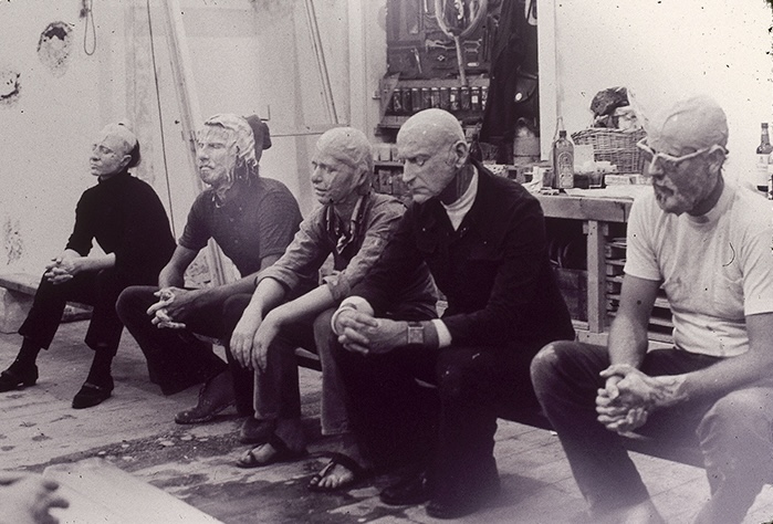 The melancholy visages prompted by the dull-colored slip also alludes to contemplative forms such as Auguste Rodin’s bronze Burghers of Calais (1884-1889), where the figures are grouped together in a communal act, yet display something very un-heroic; a fatalism and acceptance of their situation. With the Changes participants this effect resulted from being directed to sit and remain still while the clay hardened, yet the visual experience for the viewer projected a near frozen indifference, sparking curiosity as to whether they would get to see something more happen.