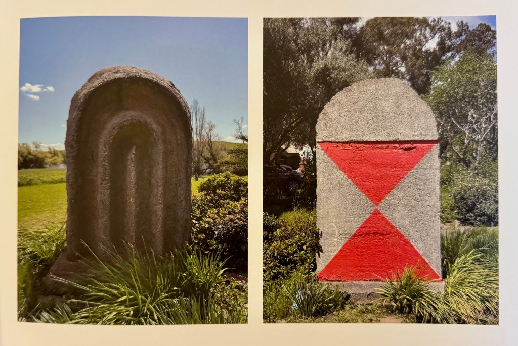 This commitment to rawness is best exemplified by Melchert’s land-art sculpture Earthdoor (1965) located at the di Rosa Preserve (now the di Rosa Center for Contemporary Art) in Napa’s Carneros region. Rather than assemble materials for the project, Melchert dug a trench into the land, making a mold he later poured concrete into, casting a nine foot tall site-specific monument. Once cast, the U-shaped piece was lifted upright. The sculpture itself remains in Napa but is represented in the exhibition through photographs and other ephemera related to the project. Importantly, Melchert finalized the piece by rendering two hand-painted red triangles on one side, set atop one another to suggest an hourglass, embellishing it with just enough of the human hand to offer a personal imprimatur of authorship, thus collaborating with the earth’s soil which had hugged the form into shape. The pattern itself, a deeply grooved surface, referenced the freshly plowed fields which were set to become vineyards in the nearby area, yet the piece itself conveys a primitive quality as if it were a monument of some kind. The texture and scale make it seem right out of Stonehenge or the Megalithic Temples of Malta. It easily could be an entryway or some type of edifice for a prehistoric site with painted triangles on its side, offering cautionary signage about how our lives are intertwined with the environment, and how we are always in collaboration with our milieu and its placement in time.