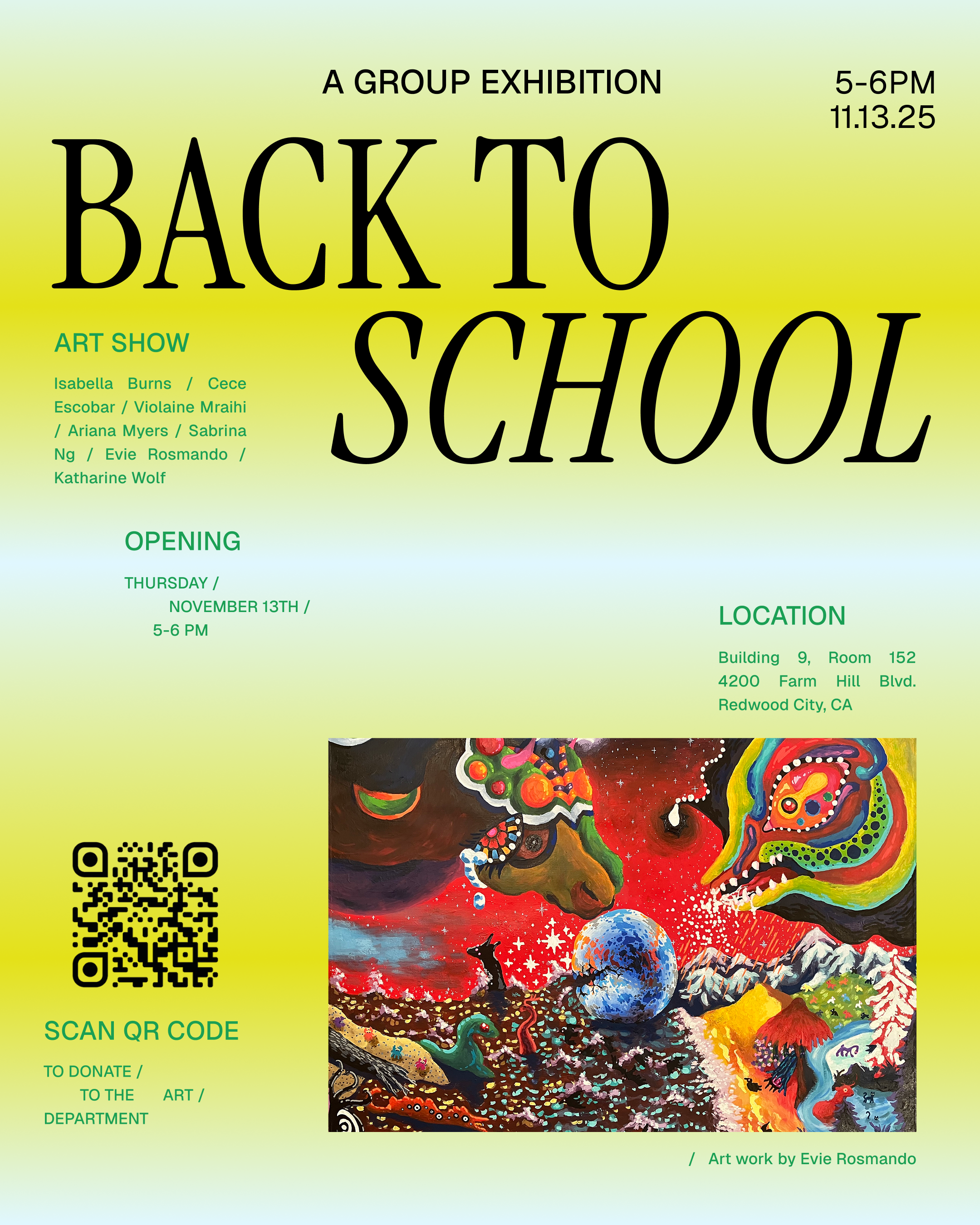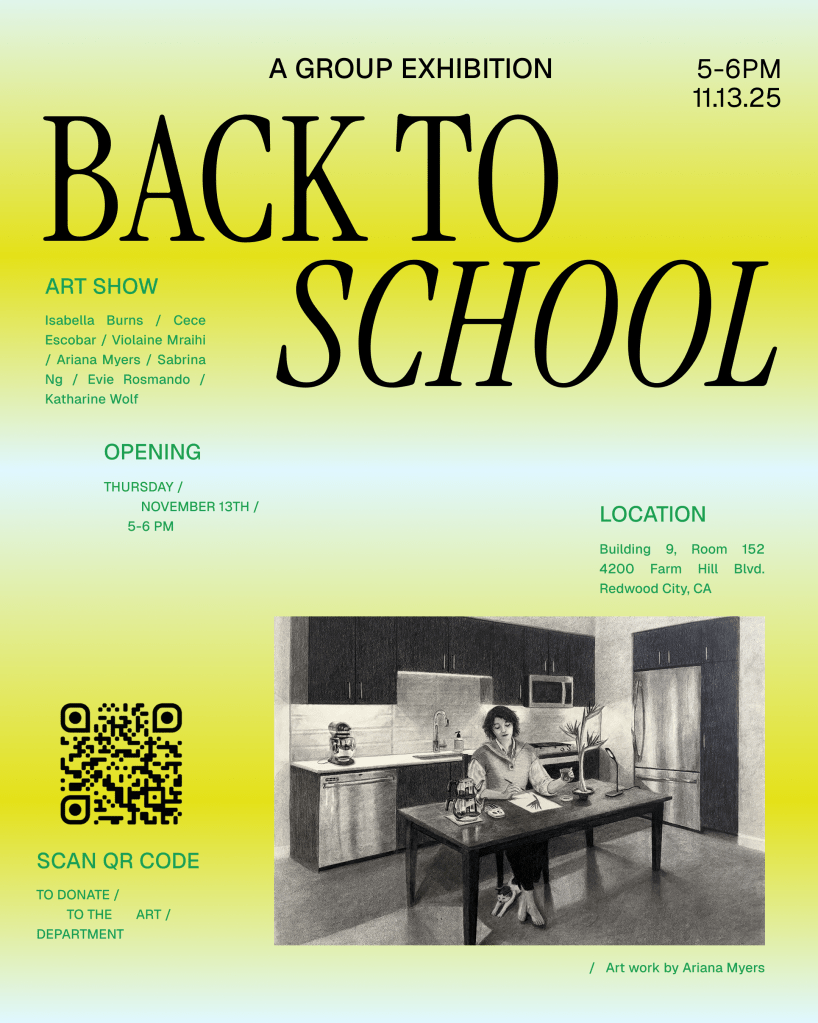 In keeping with this tradition, Emilio Villalba, an Assistant Professor of Studio Arts at Cañada College (in the Humanities & Social Science Department), curated a (just completed) exhibition of student works, “Back to School: A Group Exhibition,” featuring seven students who were asked to copy a masterwork of their choice and thereafter create an original artwork inspired by the work; an effort Villalba hoped would “transform tradition into personal vision.” The seven featured student artists included Isabella Burns, Cece Escobar, Violaine Mraihi, Ariana Myers, Sabrina Ng, Evie Rosmando, and Katharine Wolf. Advanced promotion for the exhibition noted “The resulting works span a range of media, from charcoal and graphite to oil paint, with each artist presenting their mastercopy alongside their original interpretation. Together, these pairings reveal individual creative processes and demonstrate the enduring relevance of looking closely at art history.”
