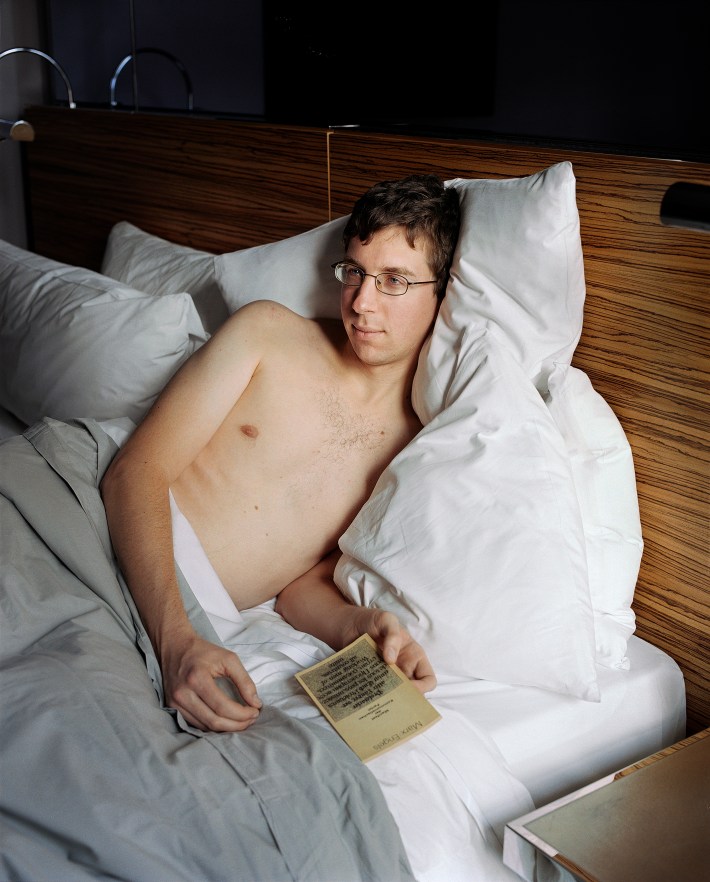 Chris Buck, Chicago, IL (2005) depicts a graduate student in politics and philosophy. He is photographed in an intimate space, lying bare-chested on a bed with a copy of the Communist Manifesto by Karl Marx and Friedrich Engels (photographer Chris Buck playfully observed that “Nothing’s sexier than that, right?”). That the photograph is posed on Chris Buck the photographer’s hotel room bed doesn’t matter much as the viewer couldn’t possibly know this. Although the modern fixtures that are visible in the composition, including wood grain back board, modern side table and light fixtures, and clean linen, make a stark contrast with what you normally associate with the proletarian struggle. The confident pose conveys the certainty that many grad students have, believing their inquiry into certain rarified ideas are elevated over those the common person generally grapples with. Photographer Chris Buck observes how the photograph “Reminded me of the luxury of being in bed when you’re a student; being in bed for 12 hours reading.”