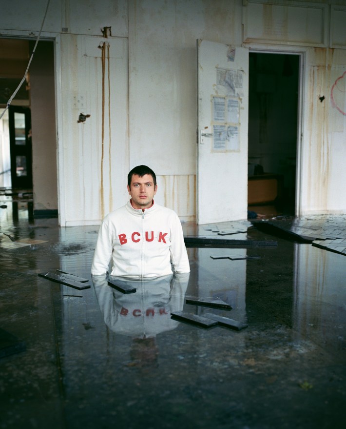 Chris Buck, Warwick, UK (2005) depicts a market manager in a rural small town in England, who offers us a matter-of-fact visage, as he stands waist deep in water in what looks like a derelict building. In fact, it’s an abandoned middle school that vandals have broken into and run the plumbing on the upper floors which has flooded the entire building. This Chris Buck stands on a ladder going down to the lower level, hence why the ceiling looks so high. The sewn lettering which is visible on his sweatshirt, originally spelled FCUK, the monogram used by French Connection, a UK based global clothing retailer founded in the 1970s. A clothing stylist friend has altered it to read BCUK, quite nearly BUCK. Although the subject looks quite casual and at ease, the photograph was taken in November, during the onset of winter. Photographer Chris Buck proudly notes that his subject was shivering as if to confirm the best photos happen when he didn’t protect his subjects.