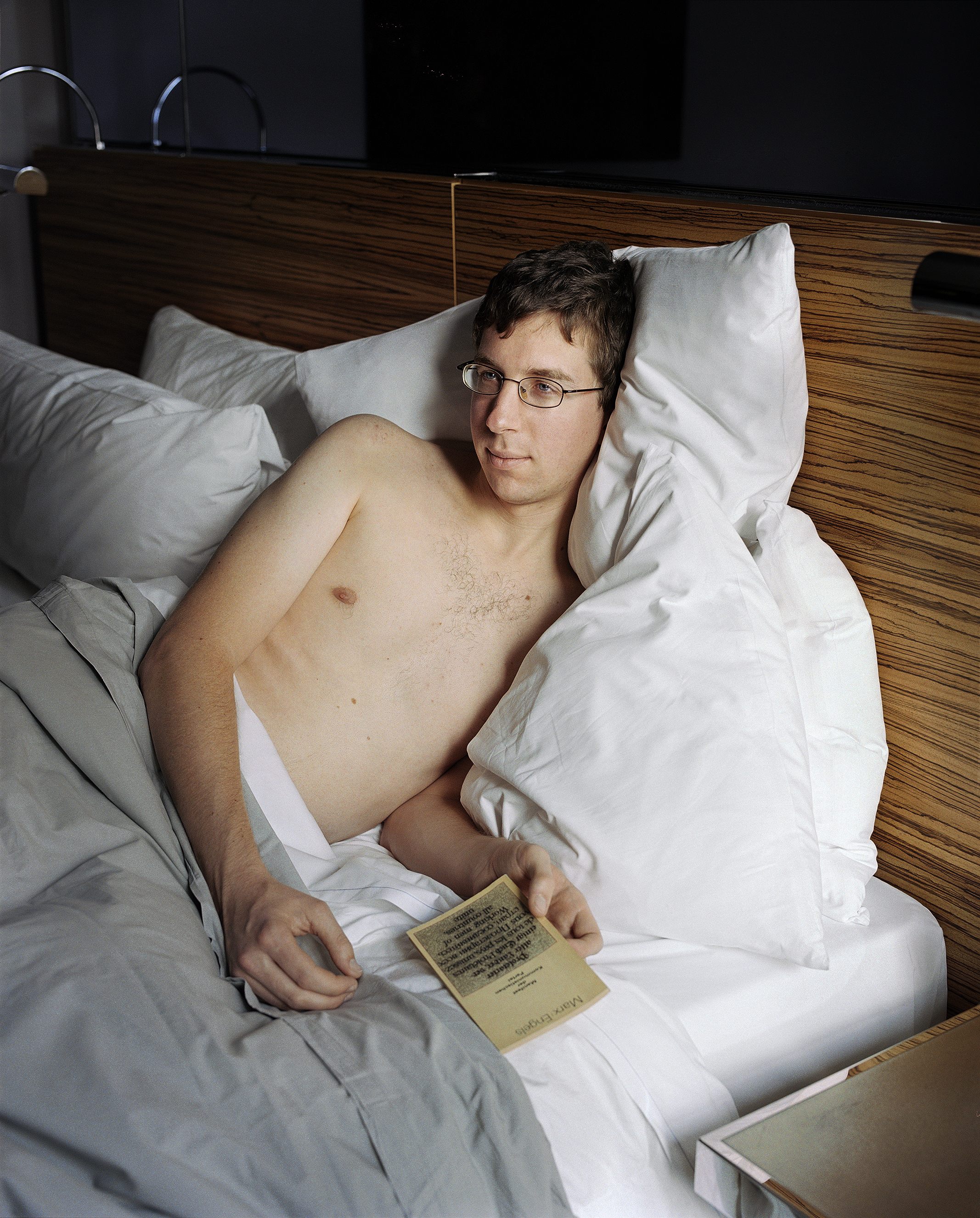 Chris Buck, Chicago, IL (2005) depicts a graduate student in politics and philosophy. He is photographed in an intimate space, lying bare-chested on a bed with a copy of the Communist Manifesto by Karl Marx and Friedrich Engels (photographer Chris Buck playfully observed that “Nothing’s sexier than that, right?”). That the photograph is posed on Chris Buck the photographer’s hotel room bed doesn’t matter much as the viewer couldn’t possibly know this. Although the modern fixtures that are visible in the composition, including wood grain back board, modern side table and light fixtures, and clean linen, make a stark contrast with what you normally associate with the proletarian struggle. The confident pose conveys the certainty that many grad students have, believing their inquiry into certain rarified ideas are elevated over those the common person generally grapples with. Photographer Chris Buck observes how the photograph “Reminded me of the luxury of being in bed when you’re a student; being in bed for 12 hours reading.”