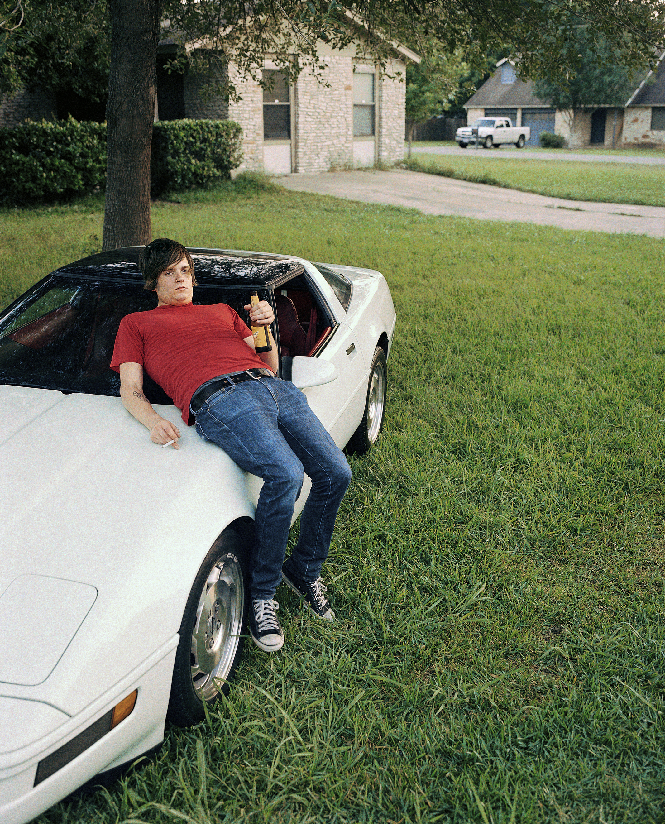 Something about suburbia and the knowing rejection of everything it represents is evident in Chris Buck, Waco, TX (2007) which captures an undergraduate history student not being very studious. Leaning back onto a sports car parked on a luscious green lawn with cigarette in hand, bottle of beer in the other, one can see the structures of rather ordinary homes; not quite the affluence and excitement that the white sports car represents. This Chris Buck is letting you know he doesn’t care what anyone else might think of him or anything else for that matter. Quite fittingly, the car doesn’t belong to him either.